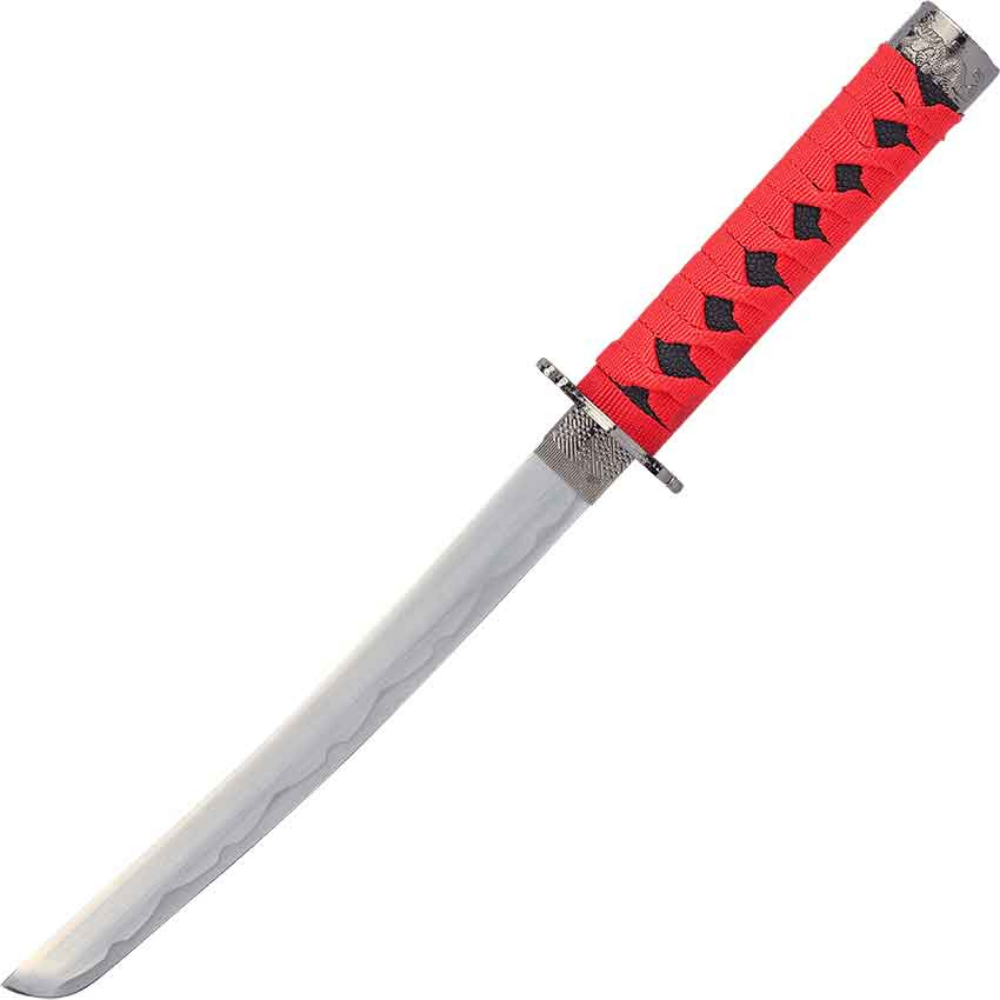 Acknowledging your strong association with the fire dragons, you display the Carved Dragon Red Saya Sword Set in your home. Made from carbon steel, this decorative sword set includes three swords of different lengths. These are a katana, wakizashi, and a tanto. All three swords feature a curved blade typical of Japanese swords as well as fabric-wrapped handles. Red fabric wraps around the handle. The swords come with scabbards. Carved dragons adorn the dark red scabbards. The scabbards also have red wrappings. Finally, the swords come with a display stand. This dragon sword set makes a great addition to any sword collection or decor.