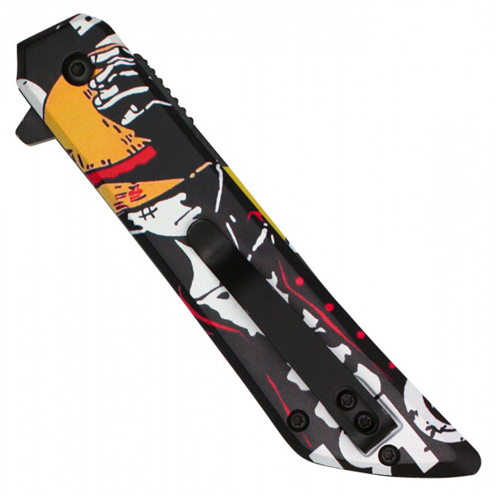 A folding knife designed for fans who appreciate both style and practicality. The Black One Piece Pocket Knife features a sharp black graphic steel blade and a sturdy handle, making it ideal for various tasks.