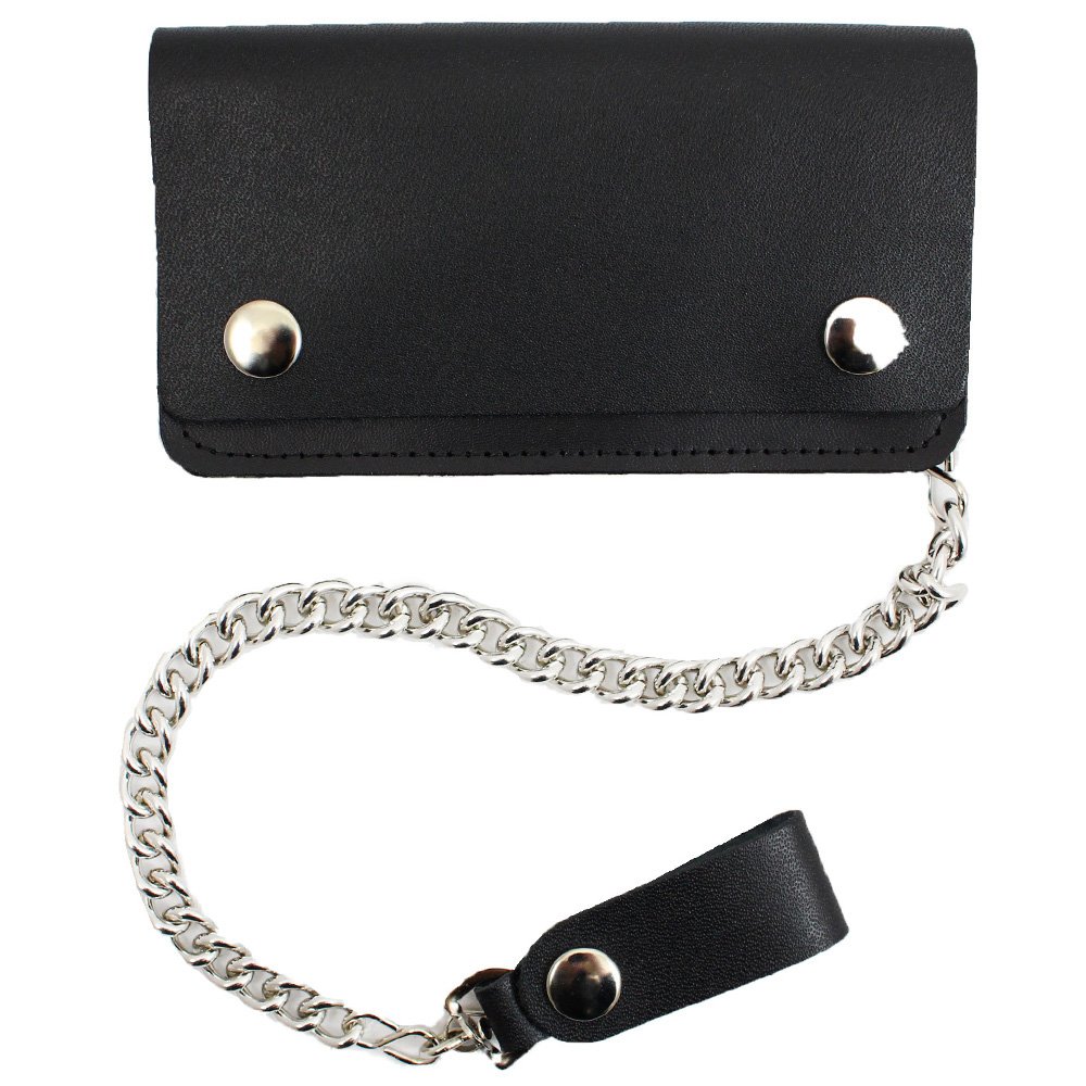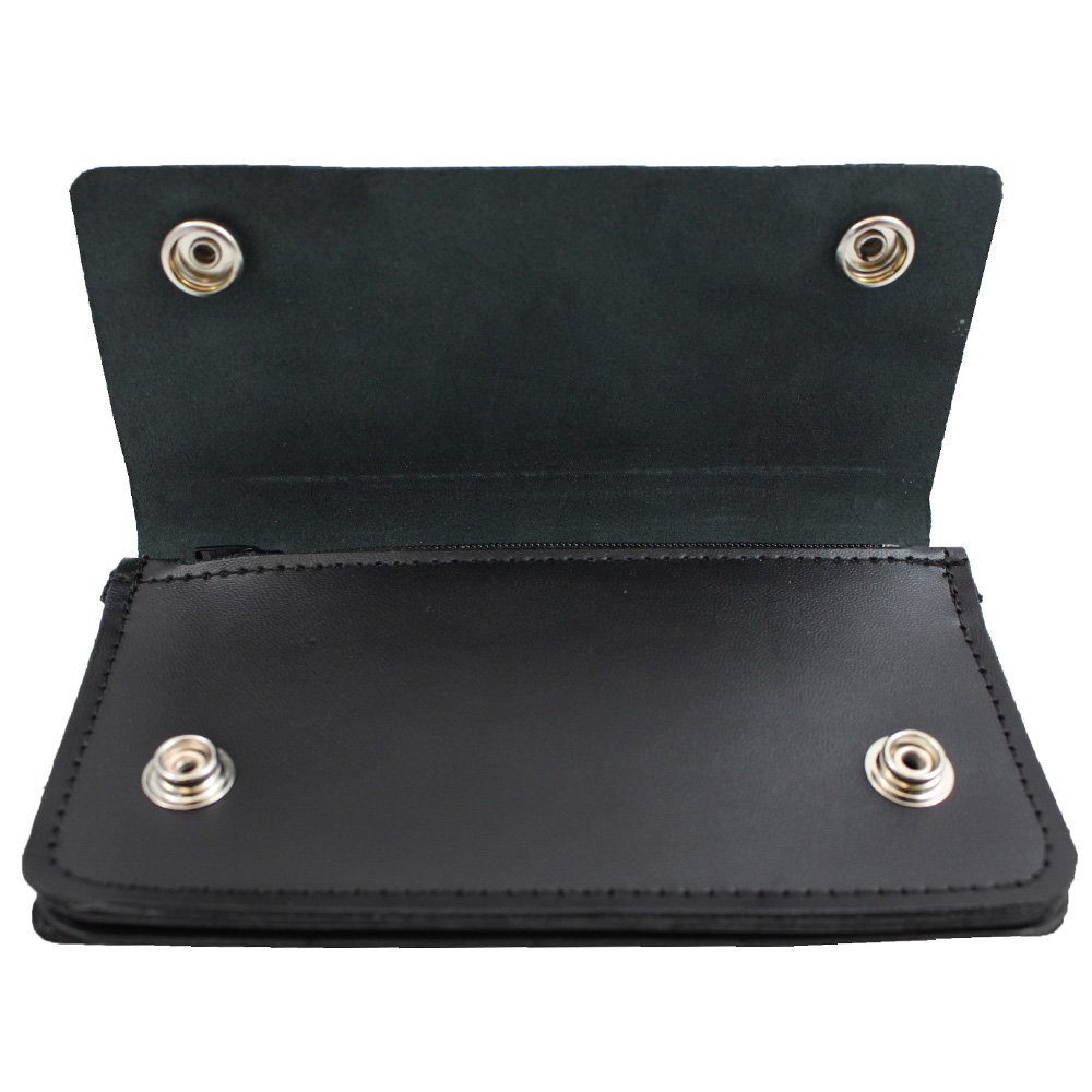 Keep money neat and organized with the 6 Inch Biker Wallet. This classic black leather wallet features an interior coin purse and money pocket for bills and loose change. It is made of 100% genuine leather and hand crafted in the USA. Measures 152.4 mm (6 inches) x 89 mm (3.5 inches).
