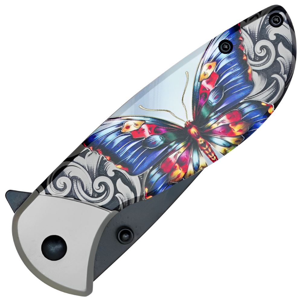 Add A Touch Of Color To Your EDC With The Wartech 7'' Black Butterfly Pocket Knife. The Razor-Sharp Black Steel Blade Offers Reliability You Can Count On, While The Butterfly-Print Handle Turns Heads With Every Flip. Equipped With A Belt Clip, It’s The Perfect Blend Of Elegance And Edge.