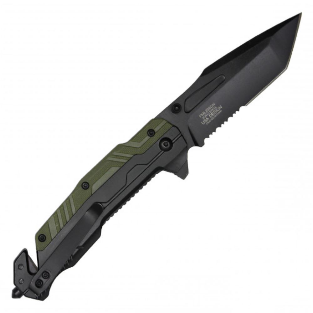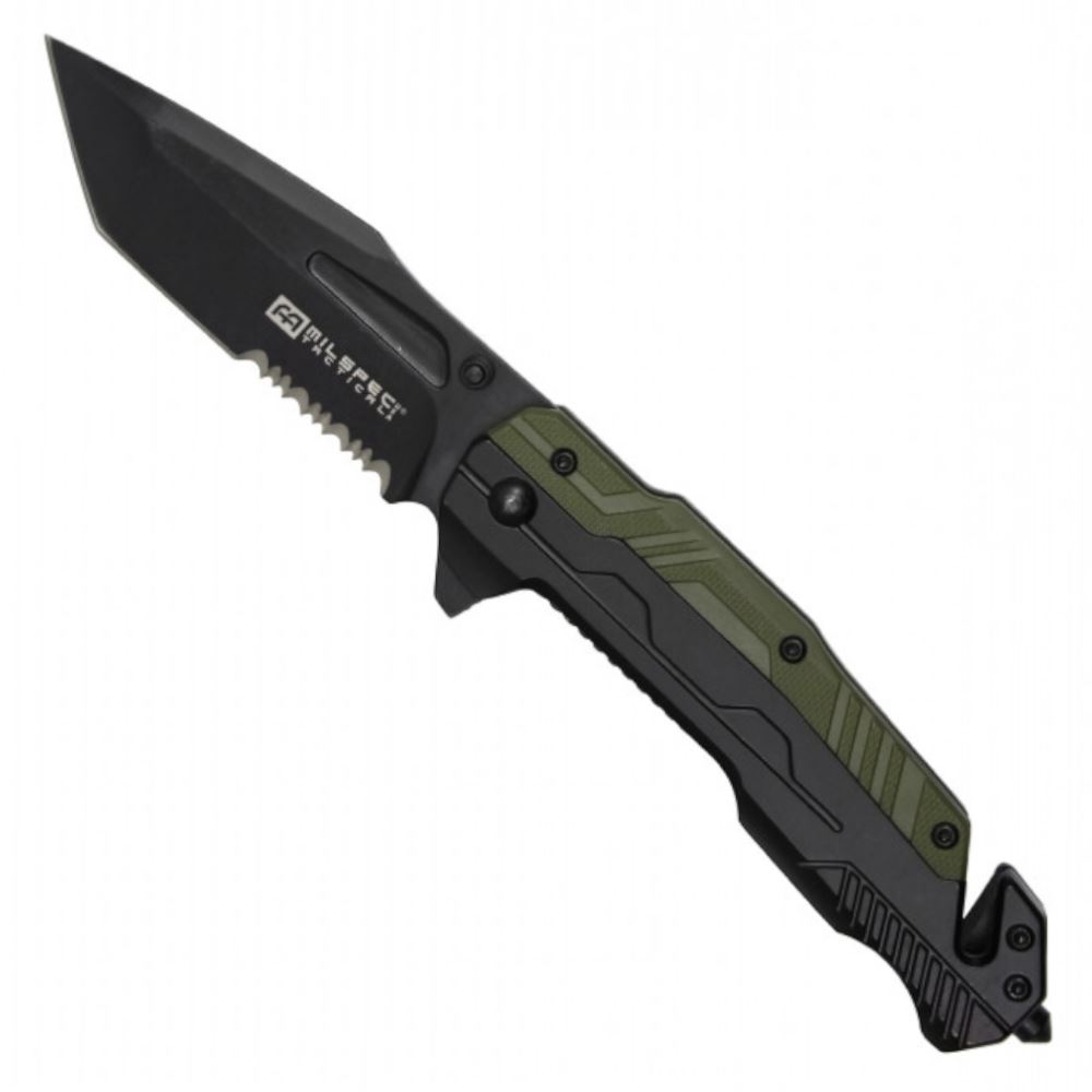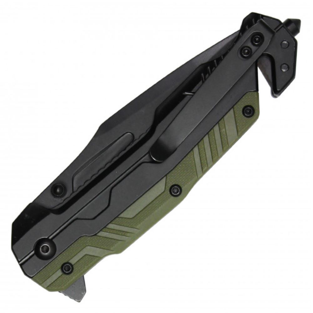 Precision Meets Power In The 8.25'' MilSpec Tactical Knife. A Bold Black Steel Blade, Rugged Green Textured Handle, And Essential Survival Tools Like A Cord Cutter And Glass Breaker - This Is The Knife That Stands Ready For Anything, From Daily Tasks To Real Emergencies.