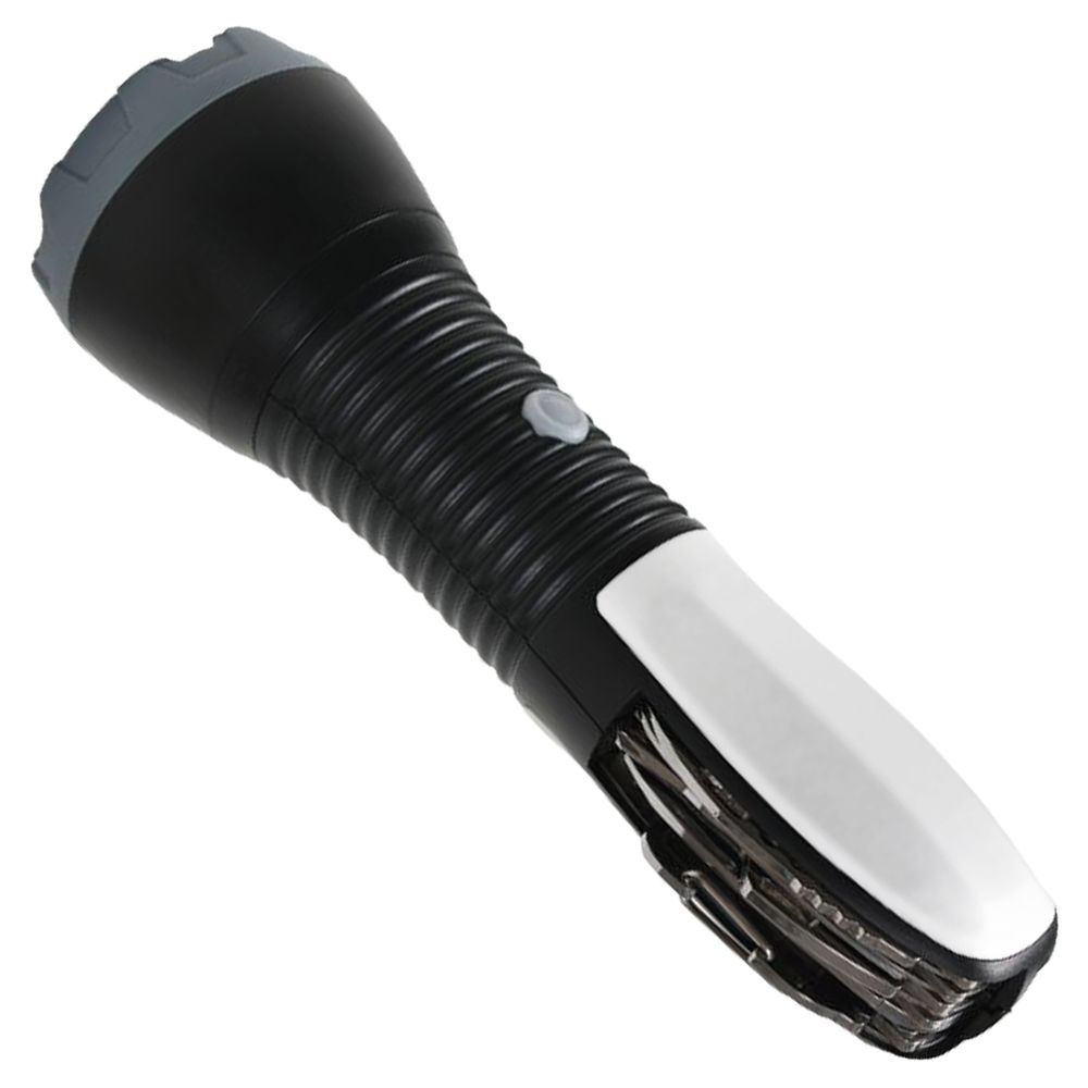 Uses 3 AAA Batteries (Not Included) , 9-in-1 Emergency Tool Includes: 3 Watt LED Flashlight , Flashing Red Light Feature , Lantern Feature , Knife , Can & Bottle Opener (Tip Can Be Used As Flathead)