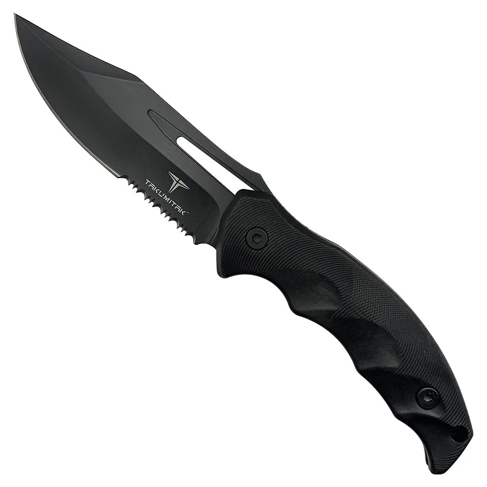 The clip point blade provides control and precision, while the partial serration makes it ideal for cutting through tougher materials. Its pressure-retention sheath and Molle compatibility give it a tactical edge for quick deployment.