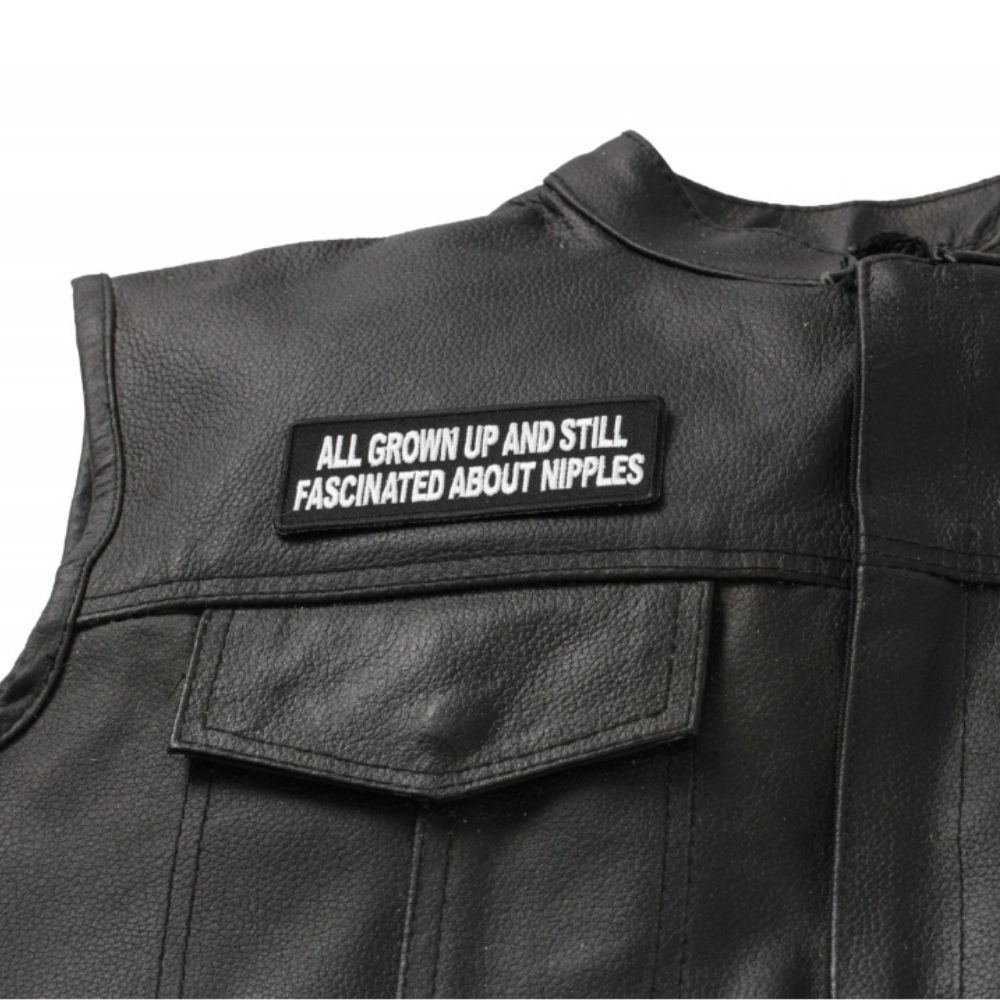 Add A Touch Of Whimsy With The All Grown Up And Still Fascinated About Nipples Naughty Patch! This Fun And Provocative Patch Is Embroidered In Bright White Over Sturdy Black Twill, Measuring 4x1.5 Inches - A Must-Have For Anyone With A Sense Of Humor! Perfect For Bikers Or Anyone Looking To Add A Little Spice To Their Wardrobe, This Patch Is Sure To Turn Heads!