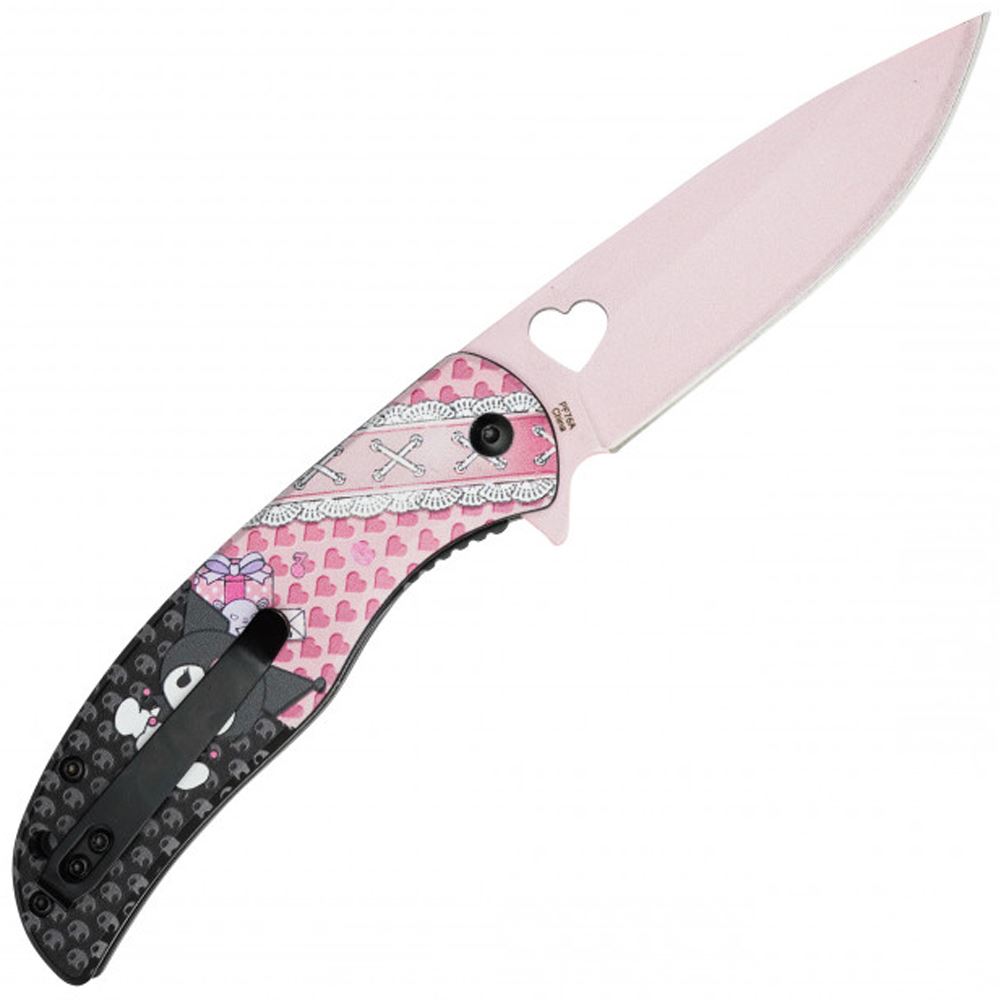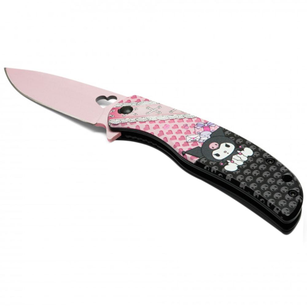 The pink and black handle, adorned with a Kuromi print, offers both aesthetic appeal and a firm grip. Equipped with a belt clip and lanyard hole, this knife provides multiple carrying options to keep it within reach.