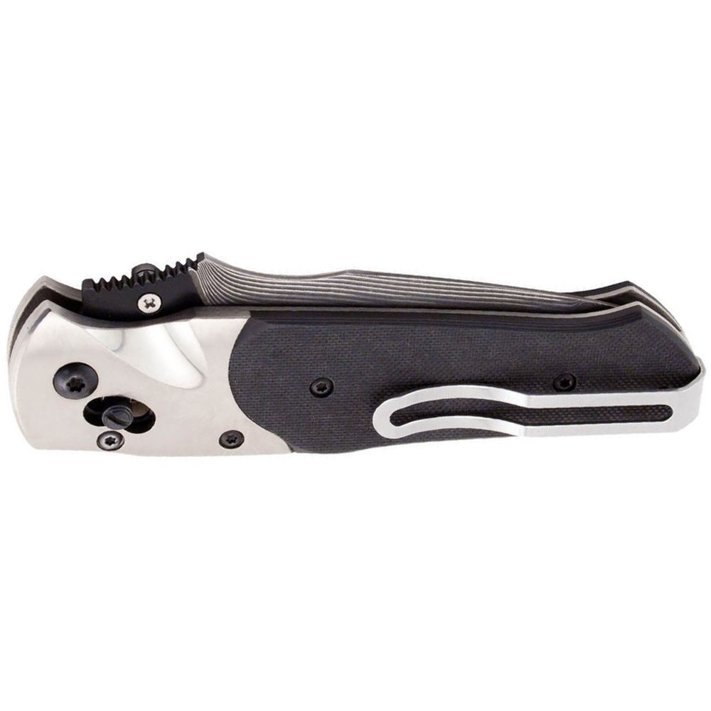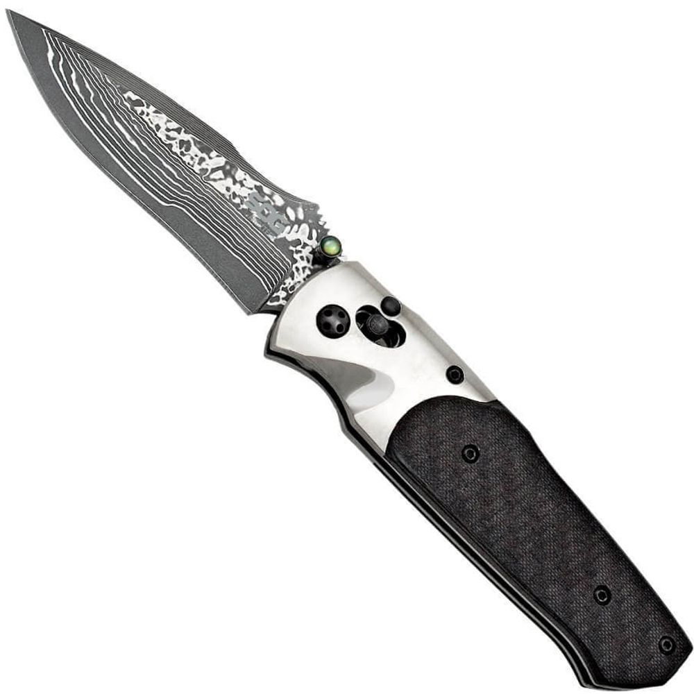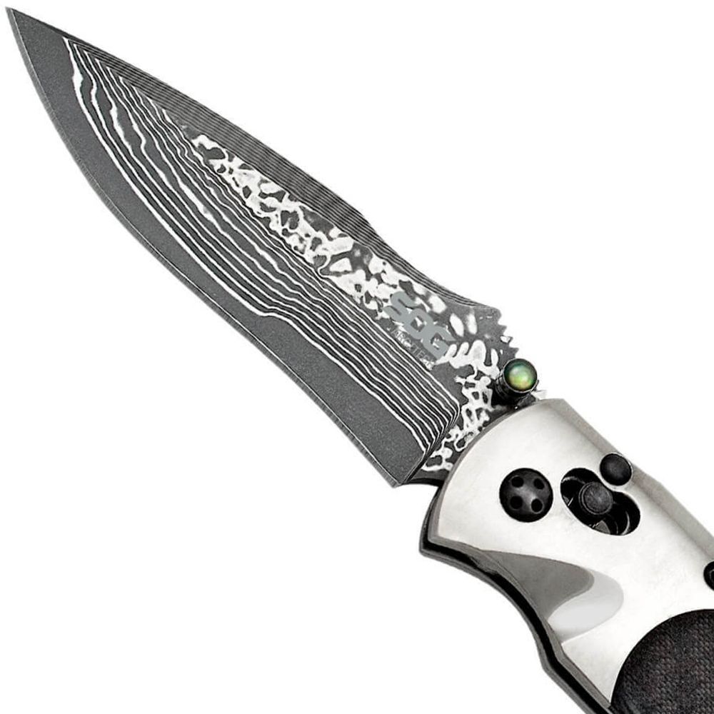 The SOG Arcitech knife with Damascus Steel Blade and Carbon Fiber Handle - One of three SOG folding knives currently in the Arcitech family. To create, a truly unique experience and first for SOG they started with one of their finest knives, the Arcitech. Then they got their hands on a stunning Japanese Damascus that uses a core of VG-10 and 15 layers of Nickel and stainless steel on either side. The steel is forged and folded again and again to produce this striking pattern. Then finally the knife is acid etched to bring the pattern up clearly (carbon and nickel become black).