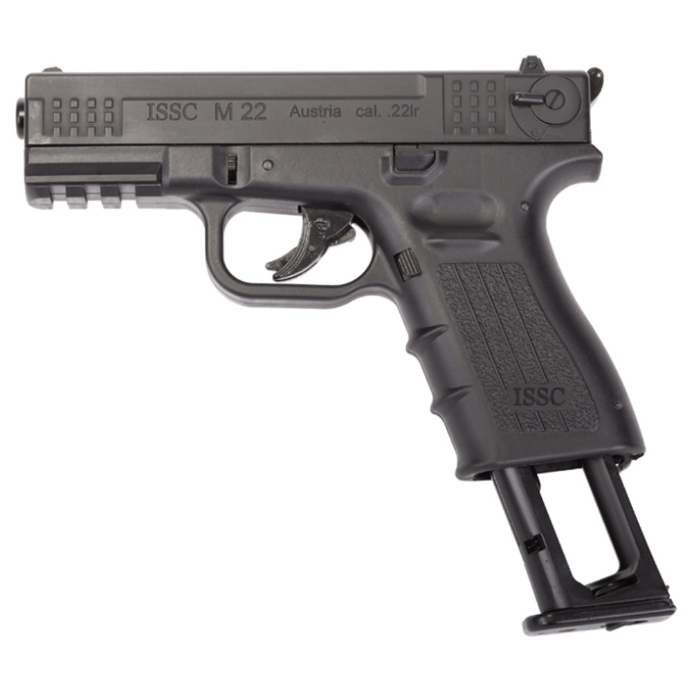 The ISSC M22 from ActionSportGames is a CO2-powered BB airgun pistol (CO2 NOT included). A standard 12-gram CO2 cartridge powers the gun and is stored in the magazine during use. The ISSC M22 is a fully licensed, semi-auto only airgun product that features a unique serial number, authentic markings on the slide and frame, a faux selector switch, and an accessory rail for mounting lights and lasers.