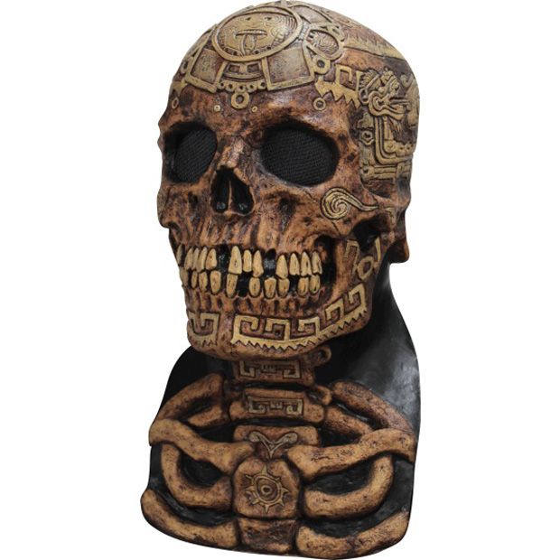 Rise up from the grave this Halloween! The spooky Aztec Skeleton Halloween Mask will help you seek vengeance on your enemies. The realistic mask features aged bones with detailed designs carved on the skull and neck. The latex mask is flexible and can be taken on and off in a matter of seconds. A neck-piece is included with the overhead mask.