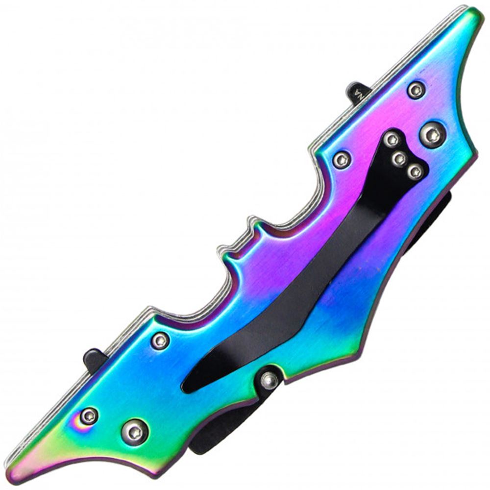 Spring Assisted Rainbow Stainless Steel Bat-Shaped Dual Blade Pocket Knife. This unique knife features stainless steel dual black blades and a striking rainbow tinite bat stainless steel handle with a belt clip. Make a bold statement with this formidable and eye-catching knife.