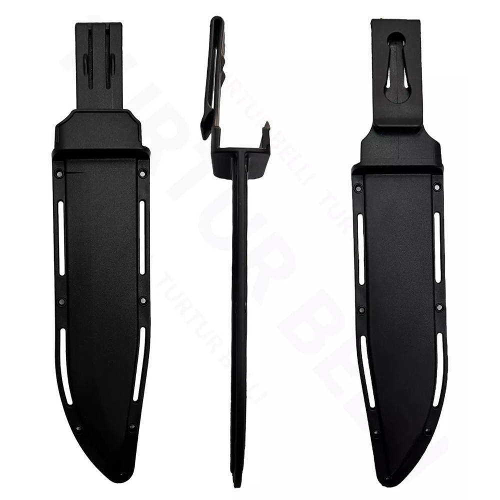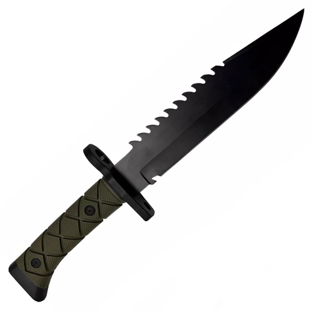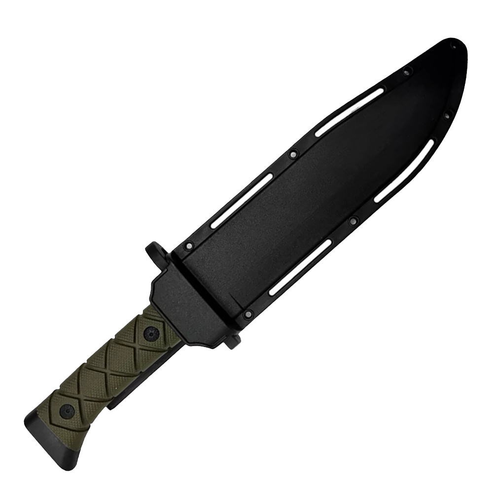 The 8-inch serrated steel blade is designed to tackle a variety of cutting tasks with ease, making it an essential tool for outdoor and tactical applications. Its 6-inch green and black handle provides a firm grip, ensuring stability during use. A hard sheath offers convenient storage and protection when not in action.