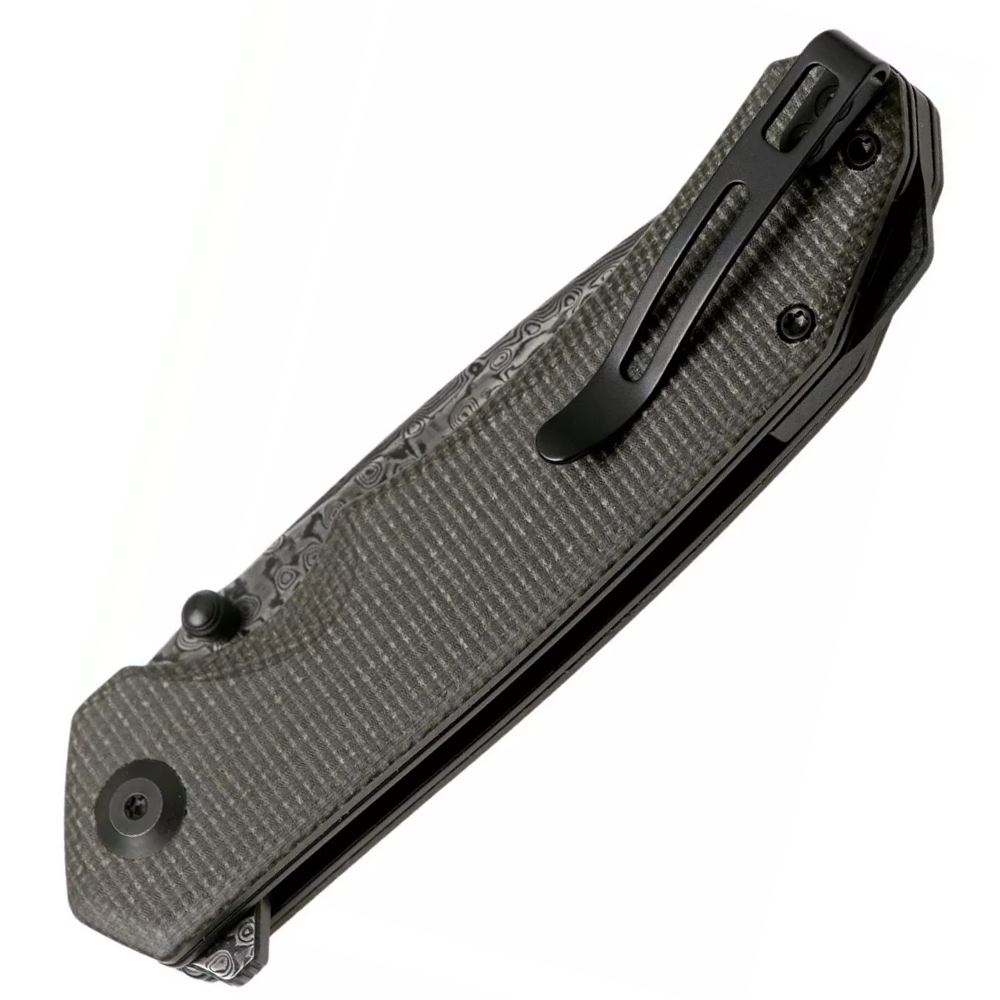 The first and most recognizable part of this design is the black hand-rubbed Damascus drop point blade. It's big, it's broad, and it's flat ground for toughness. The action is very pleasing as the size of the blade, the detent, and the caged ceramic bearings make it buttery smooth using the studs or flipper tab. This tab acts as a finger guard preventing you from accidentally sliding forward onto the blade when thrusting, stabbing, or slicing. The ergonomic handle has a solid feel provided by the stainless steel liners and we don't think it gets any more comfortable than this.