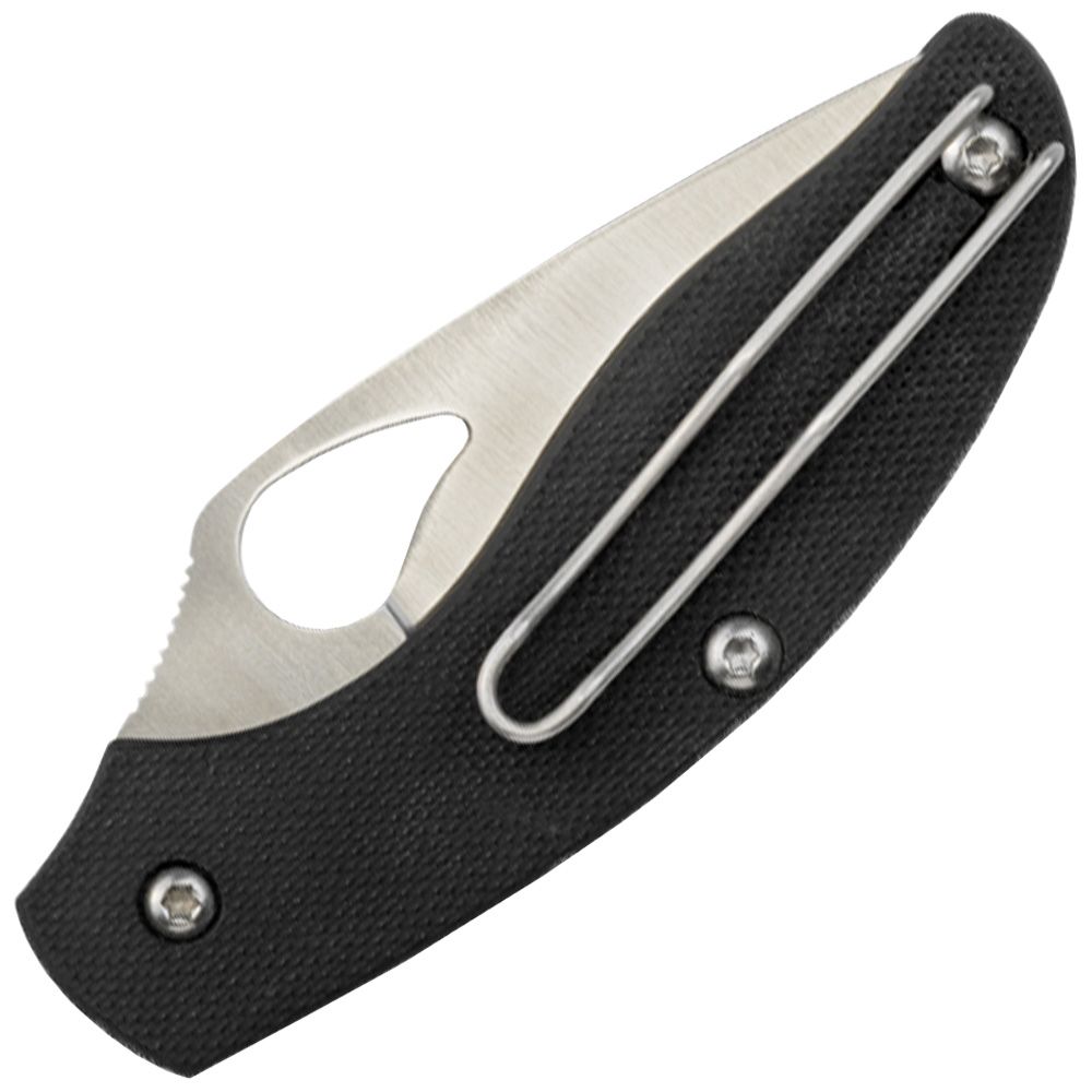 The Tern has a black G-10 handle resistant to warping and fading. The blade is held in the open position during cutting by a notched-joint at the knife's pivot. When closing the blade, the notch produces resistance functionally similar to traditional slip-joint penknife. To enhance control and comfort there's a deep finger choil which jogs the index finger into position on the bottom of the blade directly under the thumb.