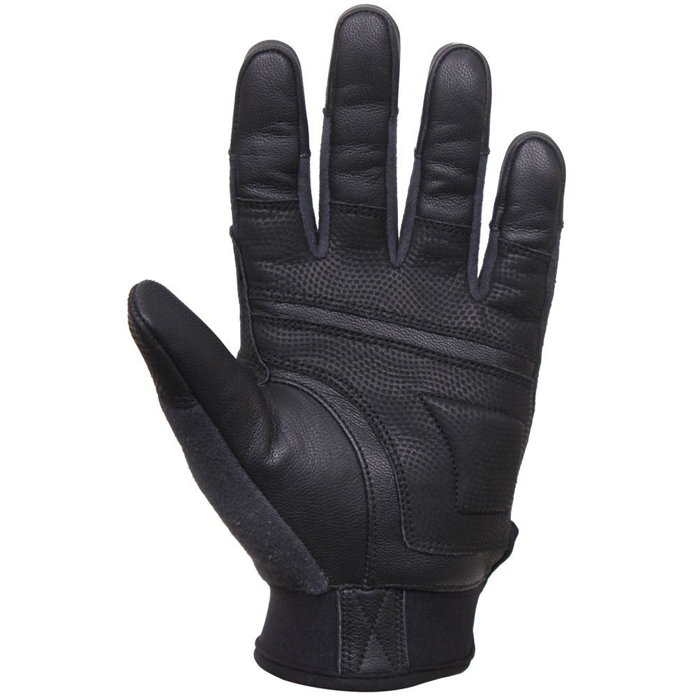 Hard Knuckle Gloves have molded carbon fiber inserts surrounded by textured genuine leather for maximum shielding and impact protection to the knuckles. Cut and fire resistant aramid fabric provide these tactical gloves optimal protection without losing mobility. The military gloves have two layers of genuine leather palms, a smooth base layer, and a textured top layer. Neoprene adjustable hook and loop closure gives this pair of protective gloves a secure proper fit. These fire resistant gloves are a perfect addition to any law enforcement, military, or other first responder personnel.