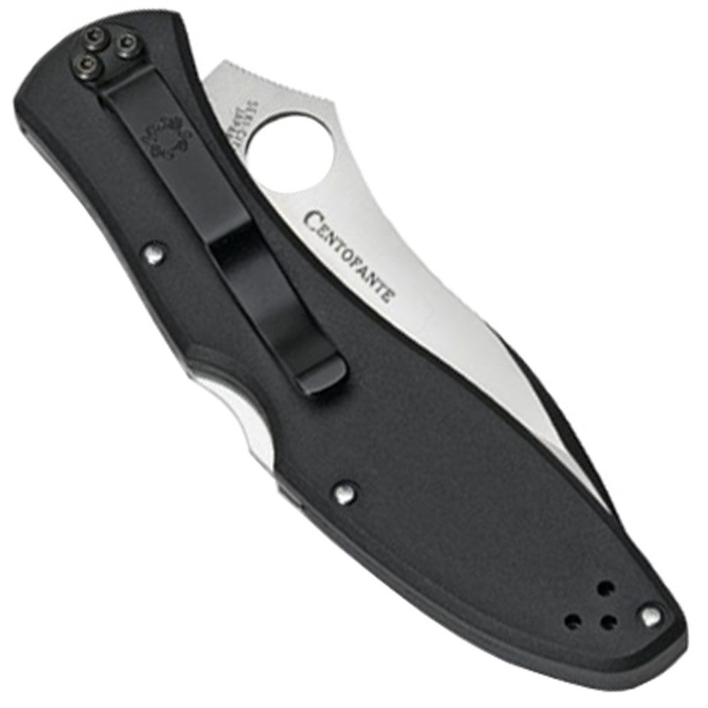 The Centofante 3 has a thin-profiled, lightweight FRN handle. Two channels are furrowed out of the handle for better grip and a Palladium silver Spyderco bug is inlayed into its surface. For added security and convenience the back-lock is positioned midway on the spine and David Boye Dent is cut from the locking lever. The VG-10 blade has both a hollow-grind and swedge-grind with non-sharpened spine serrations (jimping) to hold the thumb steady when cutting. A black steel pocket clip positions for tip-up/down, right-hand carry.