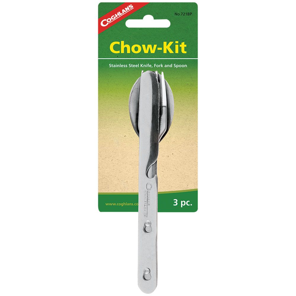 Three piece stainless steel knife, fork and spoon set clip together for easy carrying and storage. Comes with a reusable pouch.