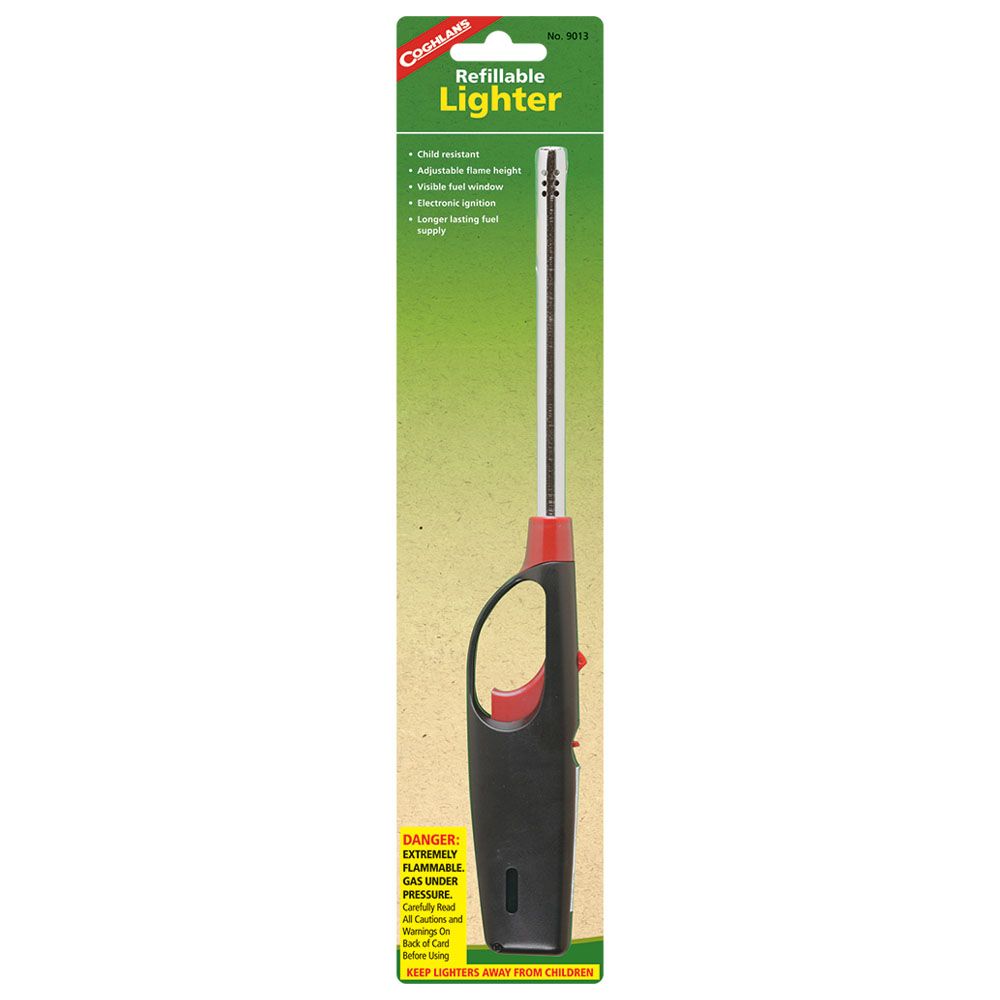 Piezoelectric activated lighter comes with a refillable butane tank and child resistant mechanism.