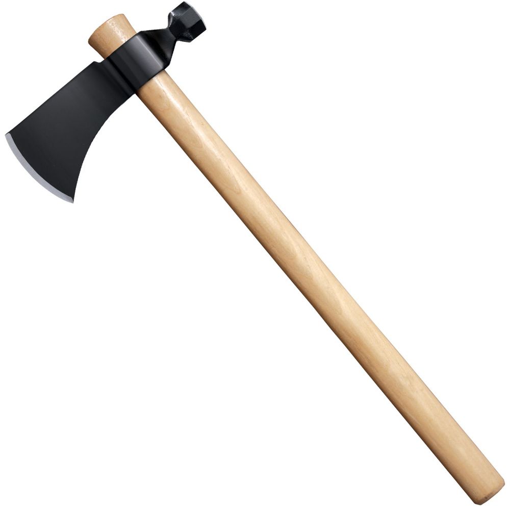 The Rifleman's Hawk has a functional hexagonal hammer poll designed for serious work, like pounding nails or stakes. Reminiscent of some early American designs, the Rifleman's Hawk features the "peace pipe" appearance that was commonly used by Native Americans during the last century. In terms of fun and sport, this hawk throws and sticks extremely well. If you want something that hits its target like the proverbial "ton of bricks," then the Rifleman's Hawk is for you! Drop Forged Tomahawks These superb tomahawks are precision drop forged from 1055 Carbon steel. Drop forging is, without doubt, the best method of manufacture for any impact weapon, particularly one with a cutting edge. During the forging process a metal ingot is heated almost white hot and then formed into shape in a series of progressive dies. The large steel dies are fixed to enormous compressed air hammers. Each die hammers the hot metal into a gradually more finished shape. The steel is kneaded and compressed into a completely homogenous mass making the grain structure uniform and minimizing gas pockets or other imperfections that can ruin the construction of a hand forged hawk. This is why most good axes, hatchets, and hammers are drop forged. These hawks are differentially heat treated. This means that the cutting edge and hammer face is fully hardened, while the balance is left relatively soft to absorb the shock of striking blows.