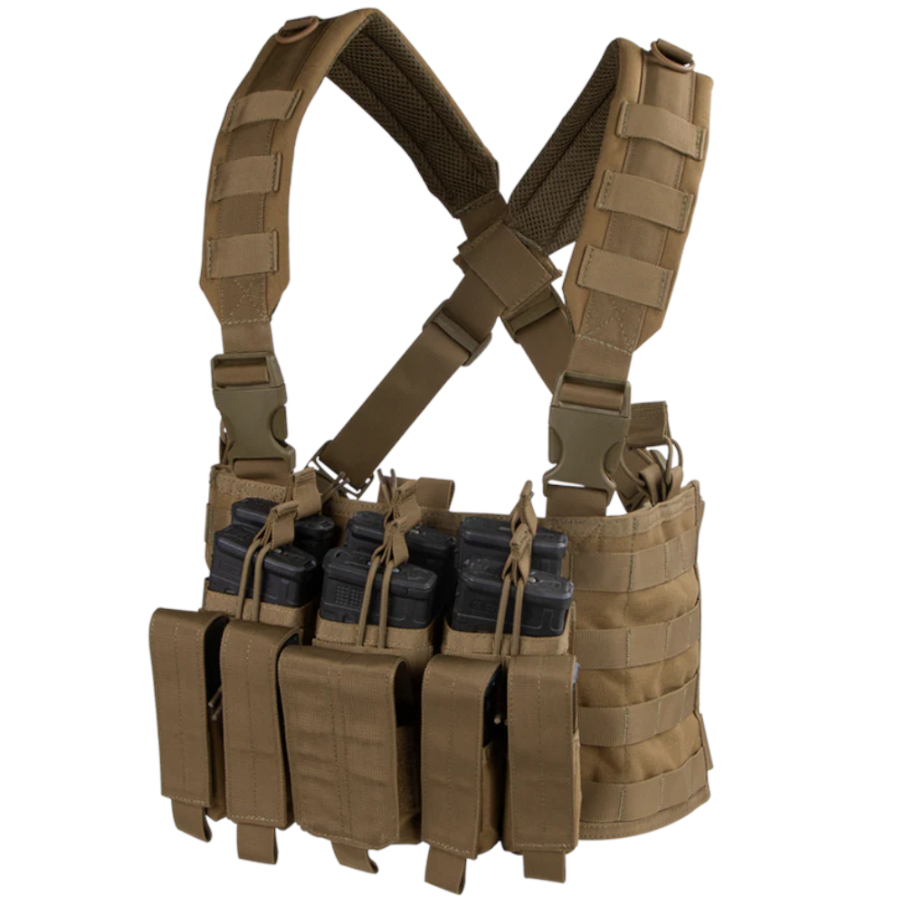 The Condor Recon Chest Rig is designed with built-in stacker/kangaroo style mag pouches to allow the user quick, seamless access to mags for faster reload. The adjustable/removable flaps on the pistol pouches also allow the user to carry a knife, multi-tool, or other small accessories.