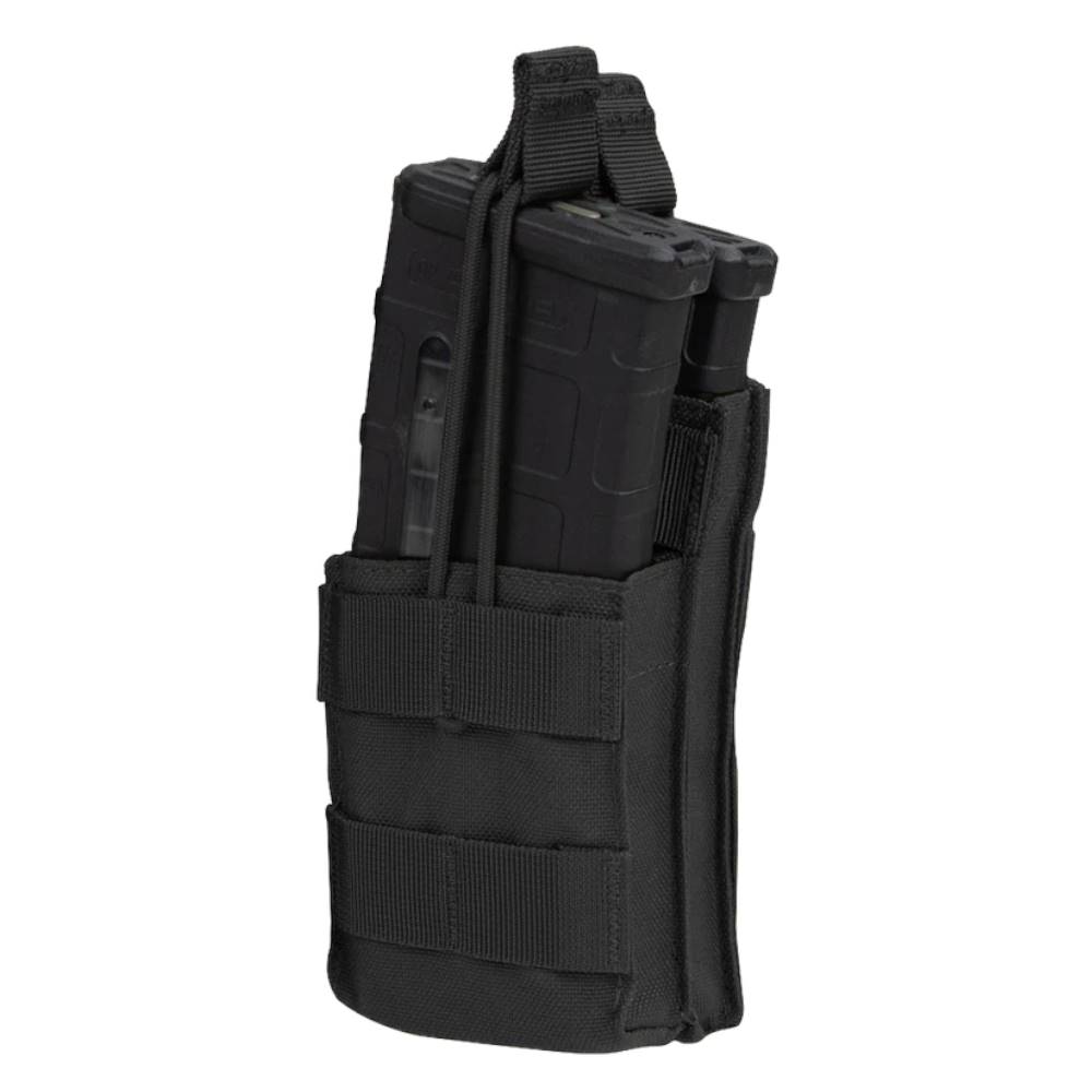 The Condor Quick Access To Magazines Pouch is a tactical accessory designed for efficient ammunition management. It holds two AR/M4 magazines in a compact, open-top design reinforced with elastic bands for secure yet quick access. Compatible with MOLLE systems, it features front webbing for extra gear attachments and measures 5.75"H x 3"W x 2"D, making it durable and functional for military, law enforcement, and tactical enthusiasts.