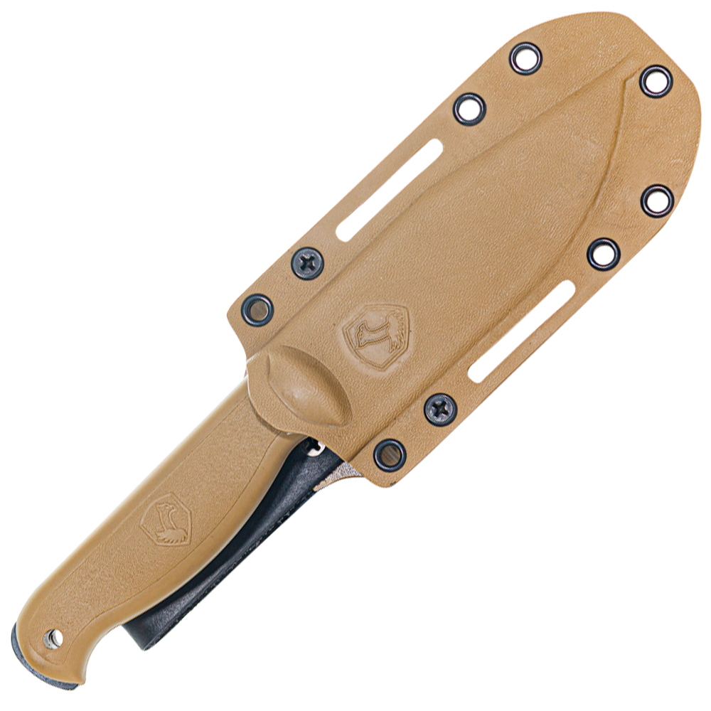 Designed for both outdoor enthusiasts and professionals who rely on a reliable cutting tool, this fixed blade knife offers a perfect blend of strength, performance, and convenience. Its 1075 high-carbon steel blade is built to withstand heavy use, delivering superior edge retention for consistent cutting power. The flat grind with a second bevel ensures it can handle a wide range of cutting tasks, from precision slicing to tougher cuts. The black Cerakote® finish not only gives the blade a sleek, tactical appearance but also provides a protective layer that enhances the knife’s resistance to rust and wear.