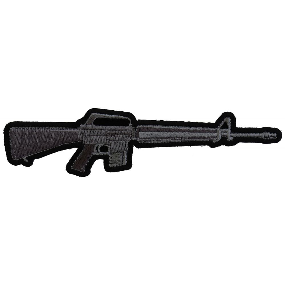 M16 Rifle Patch measures 6x1.5 inches and is Embroidered in Black / Gray. The Small Patch can be sewn on or ironed on to clothing such as Denim or Leather Jackets, Vests, Hats, Back Packs, Shirts. Features plastic backing and embroidered die cut borders.