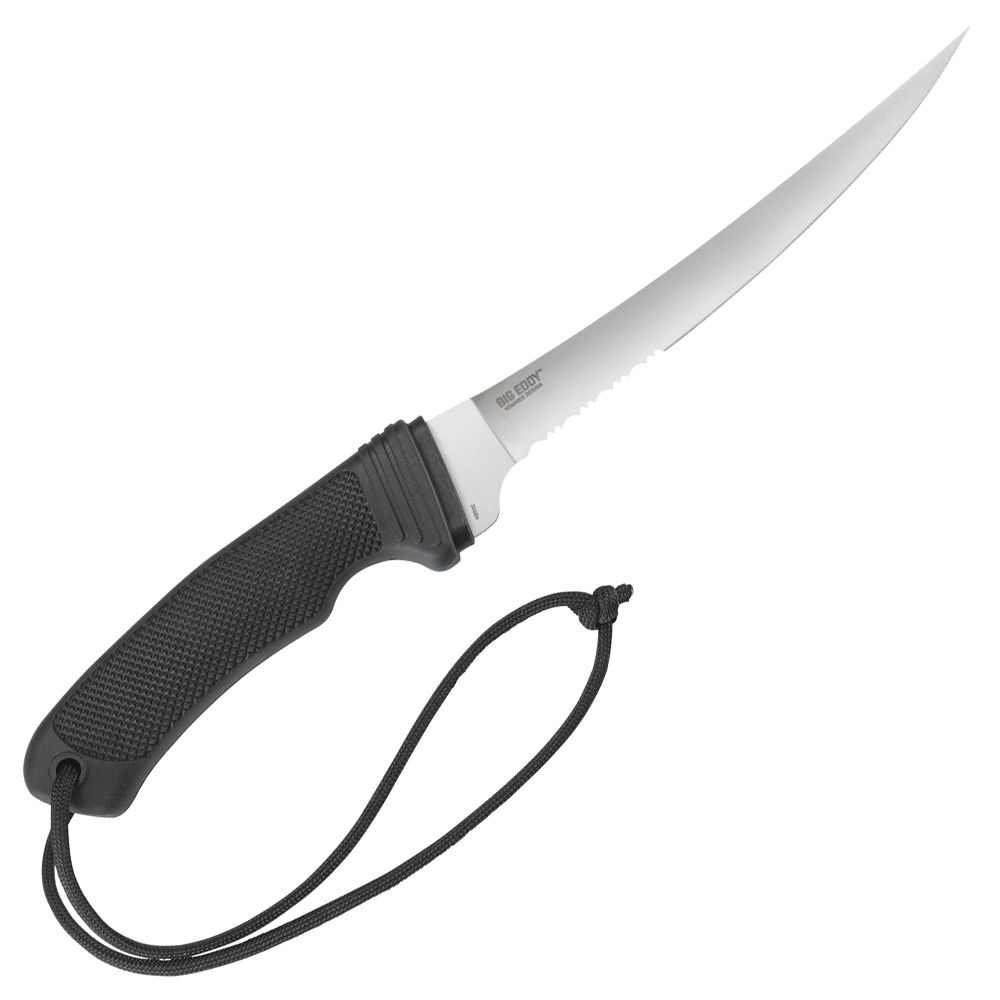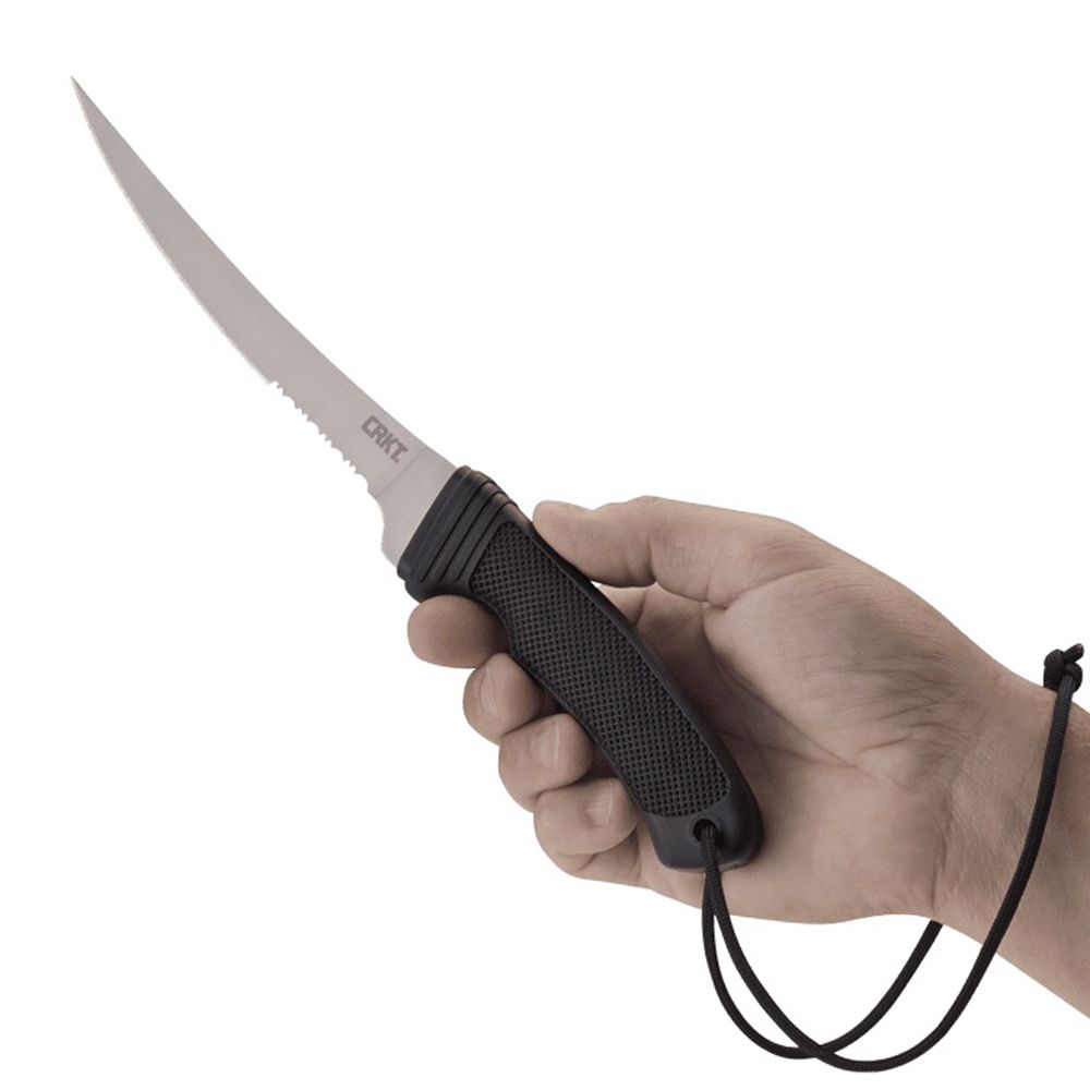 Innovation that takes your catch from the water to the frying pan in record time. This fishing knife will transform your tackle box forever. Designed by Alaska fishing guide, Russ Kommer, this blade breaks the mold for traditional fillet knife design. Most fillet knives rely on a symmetrical blade grind for cutting, but what Russ did was apply a hollow grind ton the topside and a flat grind on the bottom. This makes your fish fillets lift and float off the topside while the bottom side is gliding and not digging into the skin. The Triple-Point serrations make quick work of bones, fins and gristle. Polypropylene handle is grippy and ergonomic. A Black Polypropylene sheath keeps the blade safe in your tackle box.