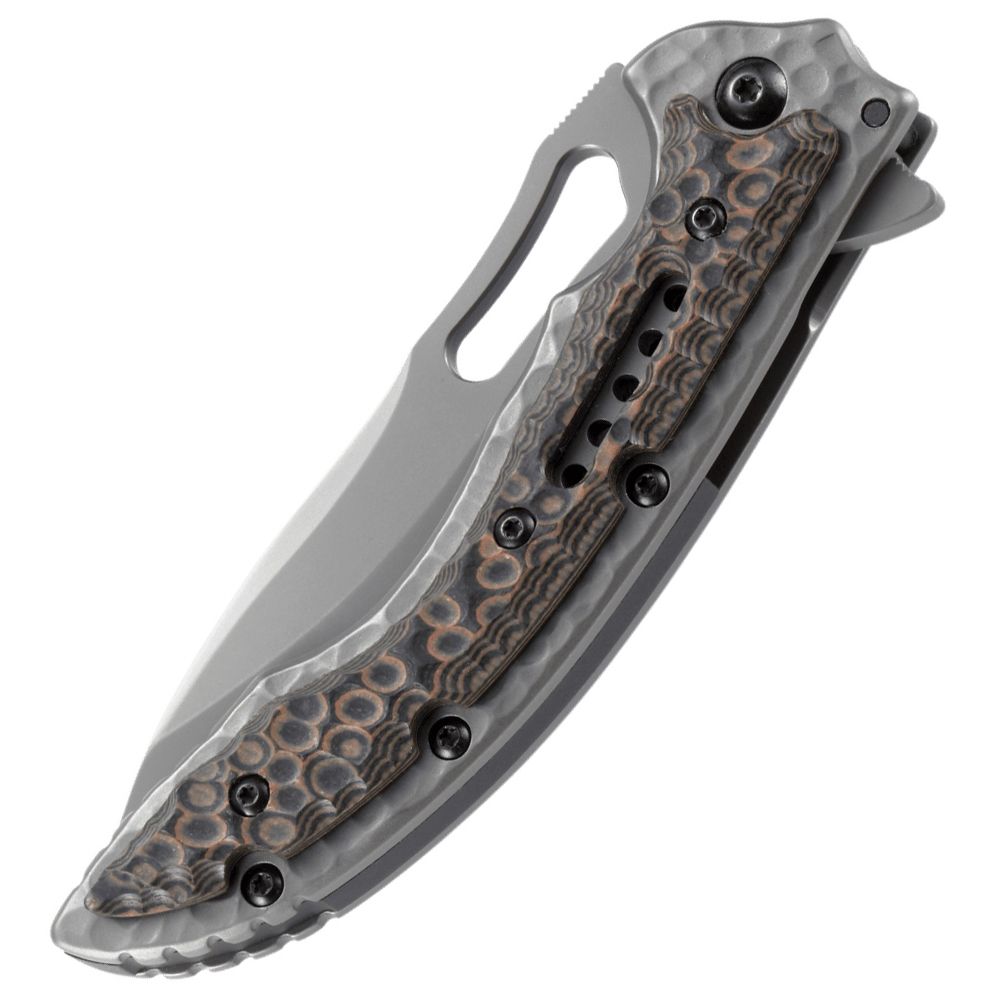 While the Fossil™ is hardcore on the inside, it’s gorgeous on the outside. The handles are made of stain-less steel with a unique hammered finish. Contoured multi-colored G10 handle overlays make it look like a gator. But the blade won’t come down and bite you in the open position thanks to a frame lock.