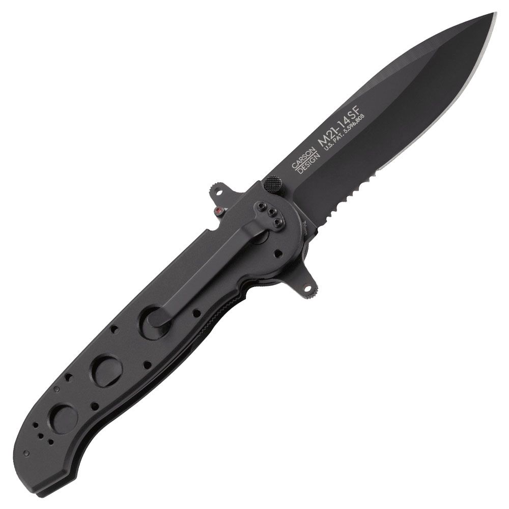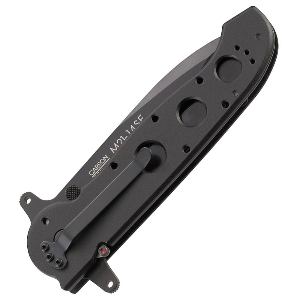 Our aluminum InterFrame SF folders feature a distinctive design that incorporates a mix of Carson Series characteristics specifically requested by military procurement specialists. They chose deep-bellied spear point blades for their exceptional strength. The open construction allows the inclusion of two Carson Flippers, creating a true hilt—a feature uncommon in folding knives.