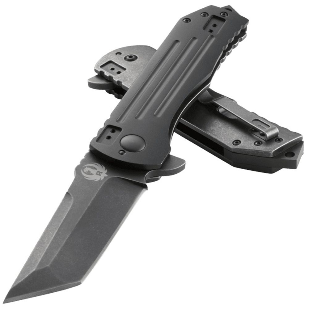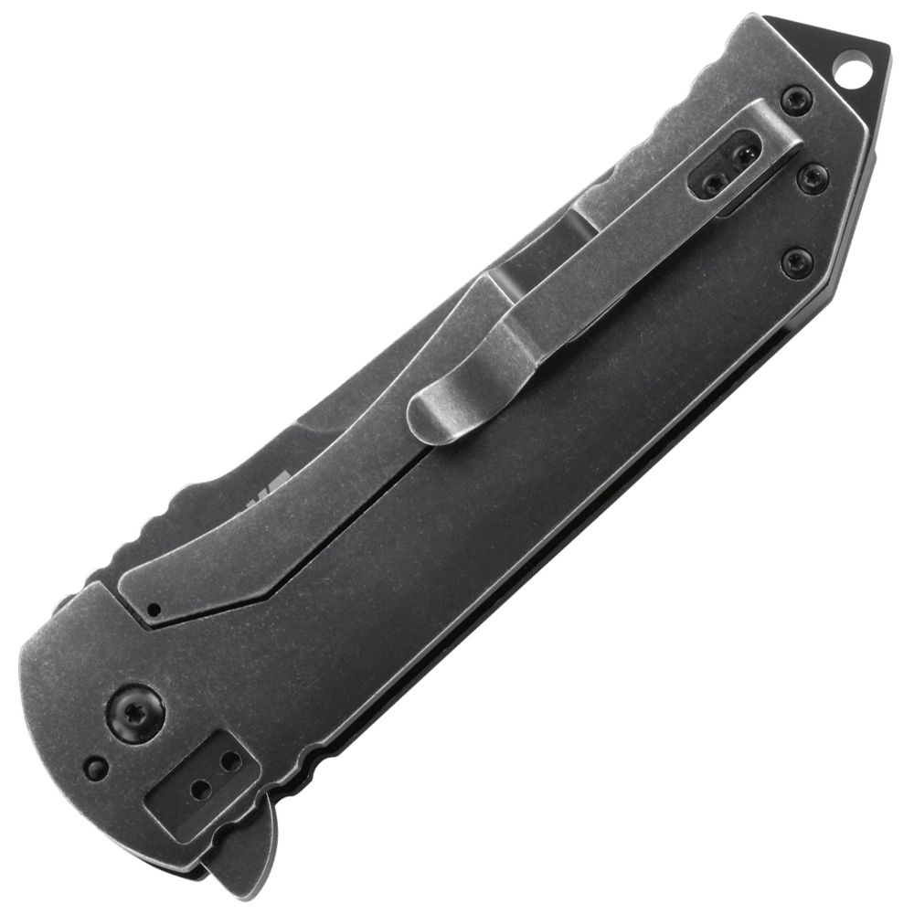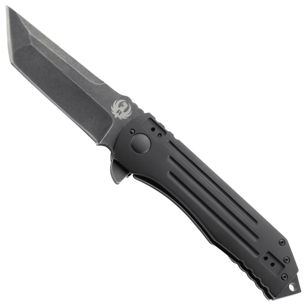 The CRKT Ruger 2-Stage’s design was inspired by American jet fighters—modern and stealthy. The stylized 4 inch tanto blade is black with a stonewash finish to highlight its sleek lines and angles. The ultra-tough anodized aluminum handle features a frame lock and stainless steel striking pommel, making it a versatile tool when open or closed. This tactical folding knife should be your first choice for any covert operation.