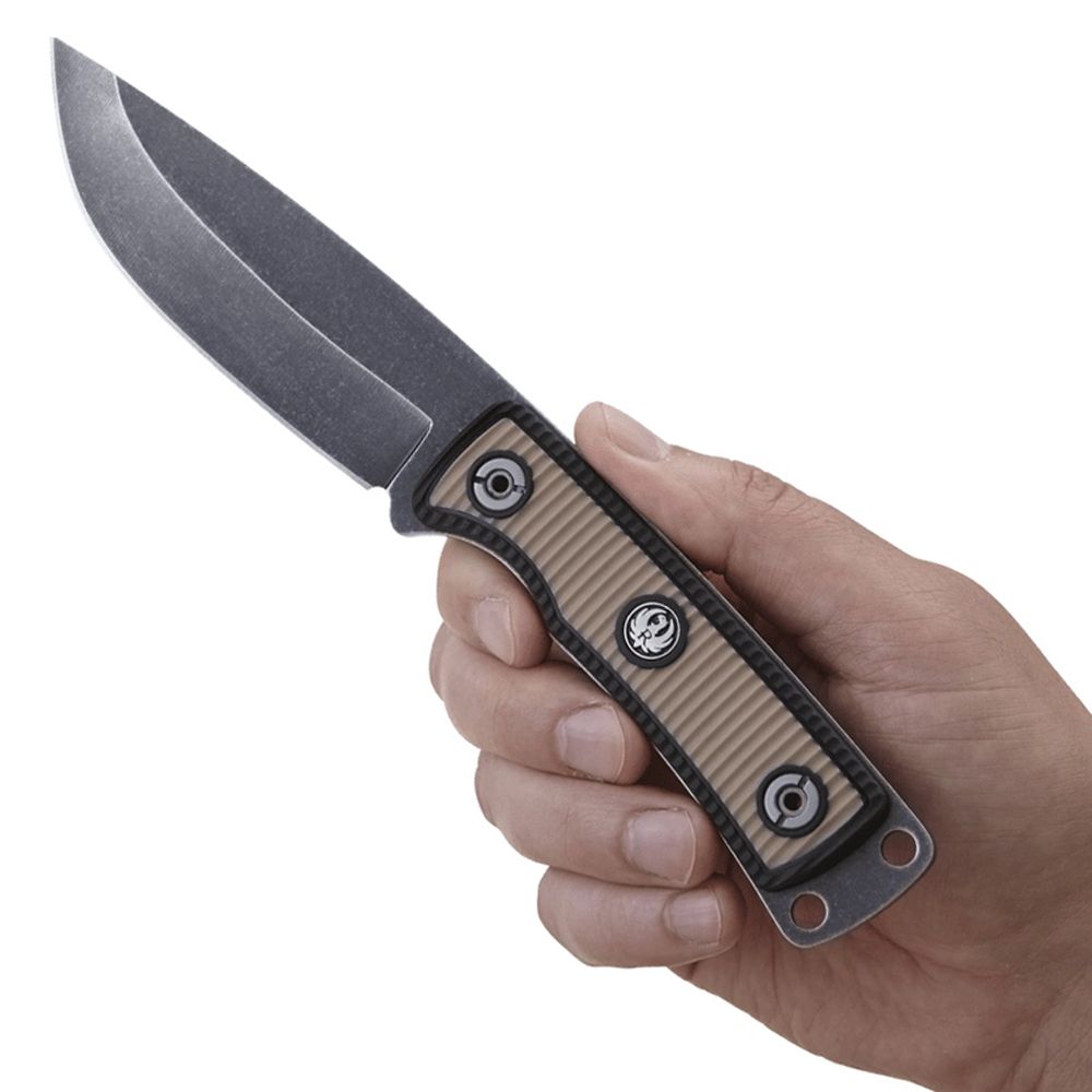 Kaboom! The Powder-Keg from CRKT and Ruger is a long knife with a short fuse. The tough 4.6 inch 8Cr13MoV steel blade is black stonewashed and practically bomb-proof. It has a full tang covered by rugged thermoplastic rubber scales to provide a firm grip under any conditions. The Powder-Keg was built to take a beating, so it’s perfect for camping use and outdoor abuse.