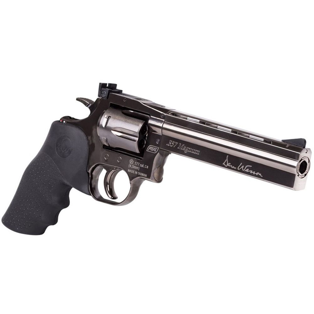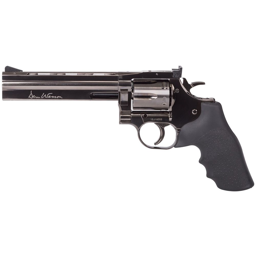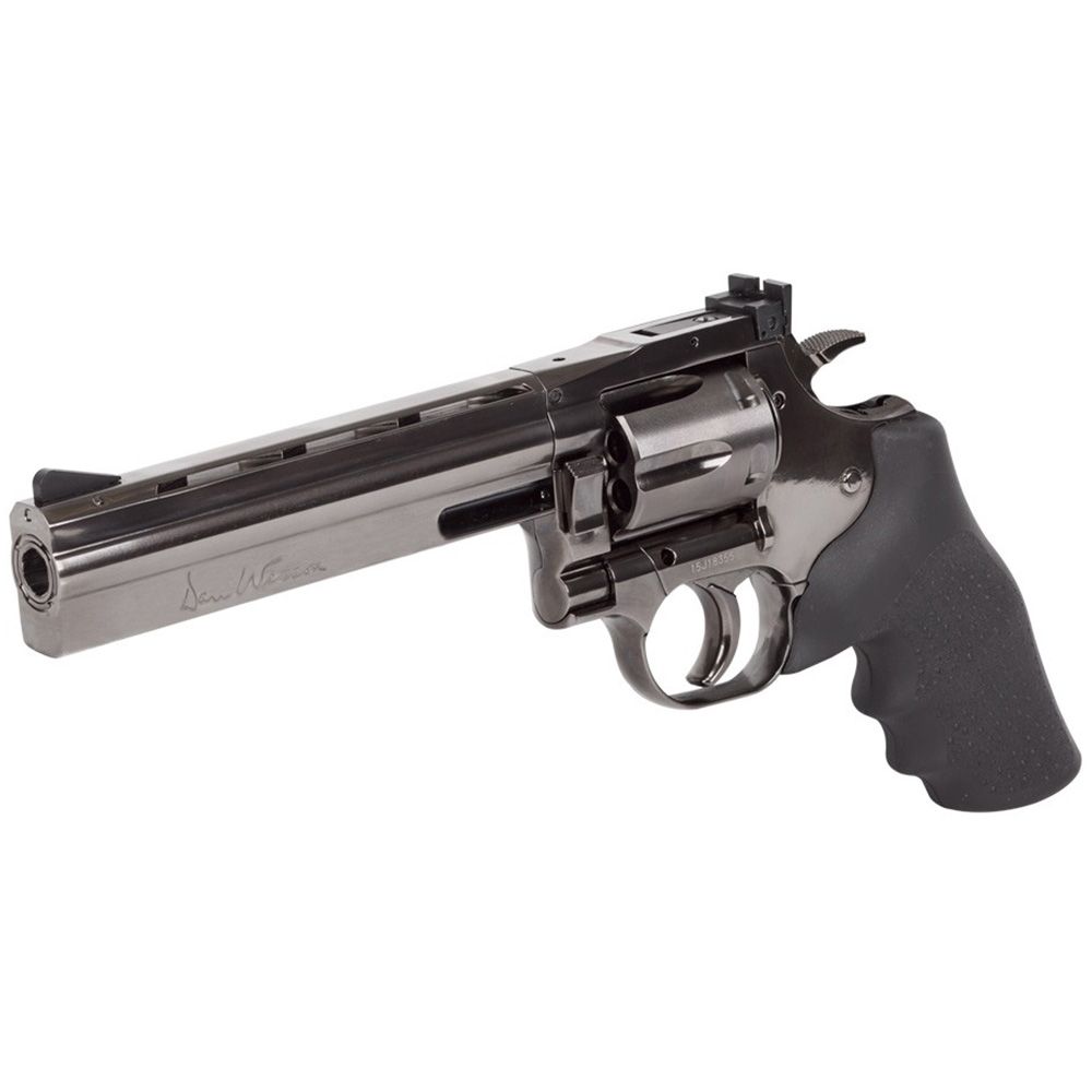Inside and out, the Dan Wesson 715 Pellet Revolver is a faithful reproduction. The full metal steel grey barrel and body are complemented by the Hogue replica non-slip grip. The gun has a realistic forward latch, clockwise cylinder spin and integrated tool for tightening CO2.