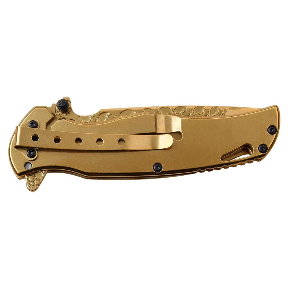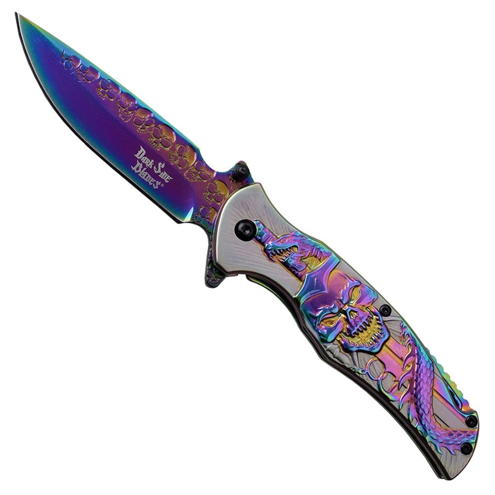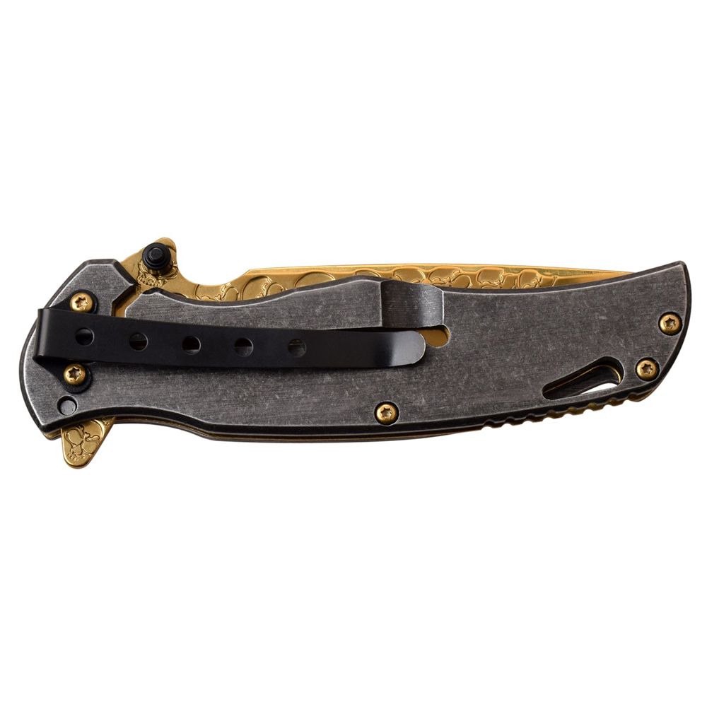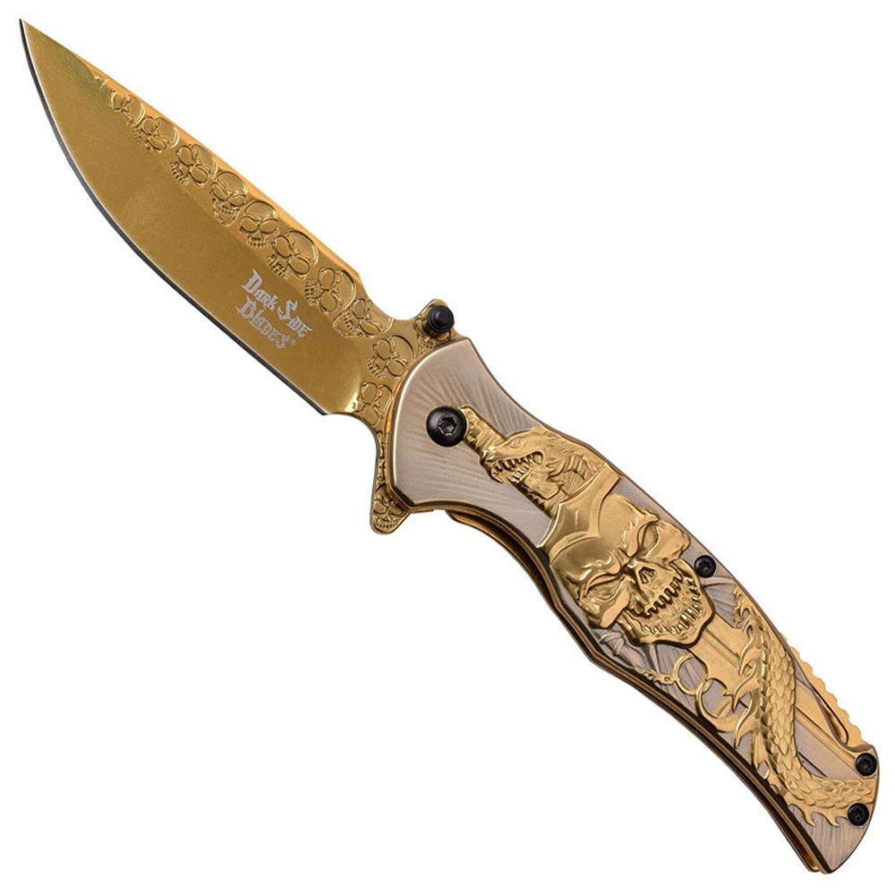 The Dark Side Blades Tinite Coated & Etched Handle Folding Knife is a striking and unique tool that blends art with functionality. The blade features a durable tinite coating, enhancing its strength and providing a sleek finish. The handle is etched with intricate designs, adding a touch of character and style. This folding knife is perfect for everyday carry, with its compact design, sharp blade, and smooth folding mechanism. For those who appreciate both craftsmanship and utility, this knife is a standout choice.