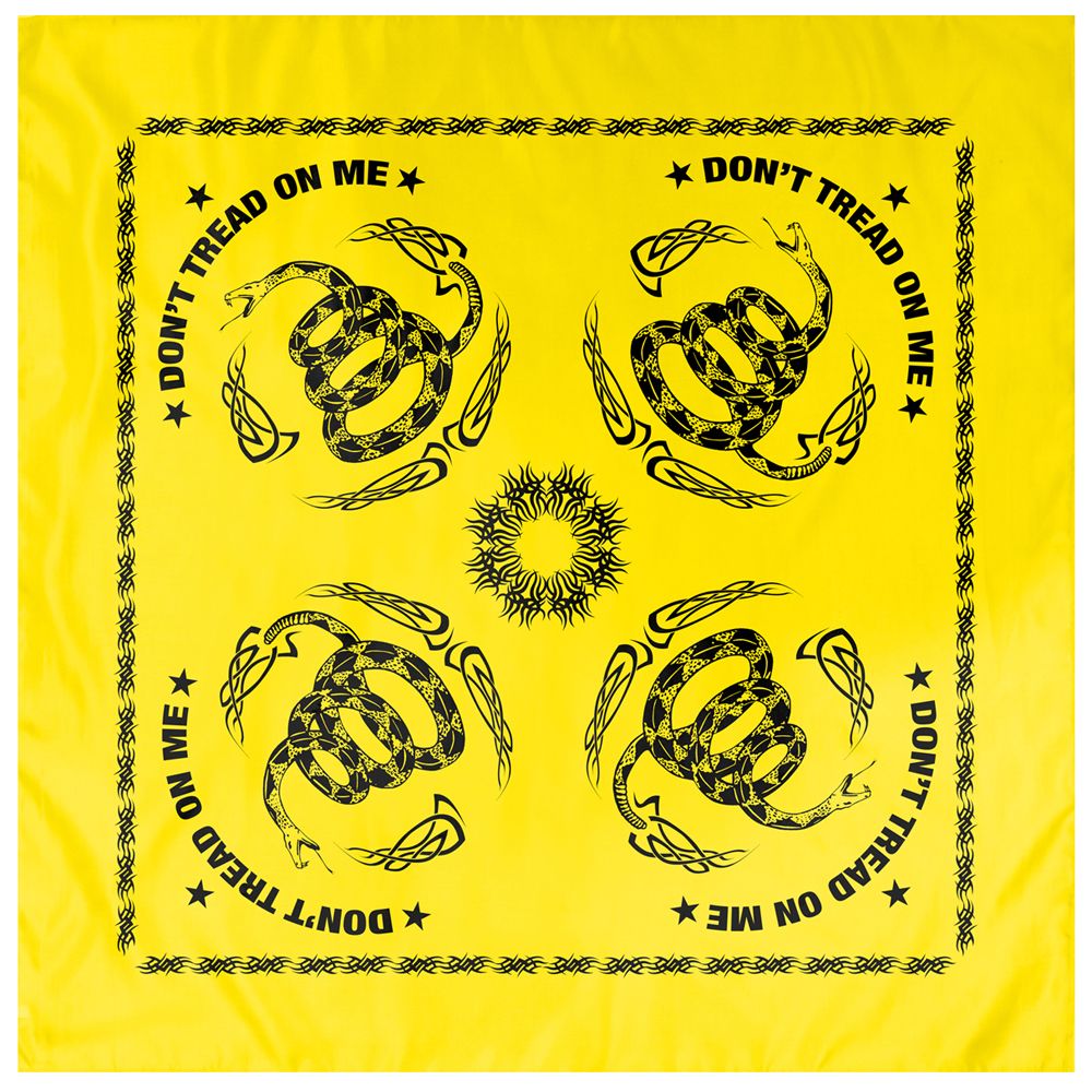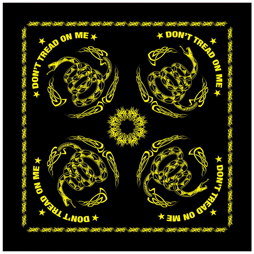 Don't Tread On Me Bandana is 100% Cotton and measures 22" X 22". The Bandana features the Gadsden Flag snake and "Don't Tread on Me" Mantra.