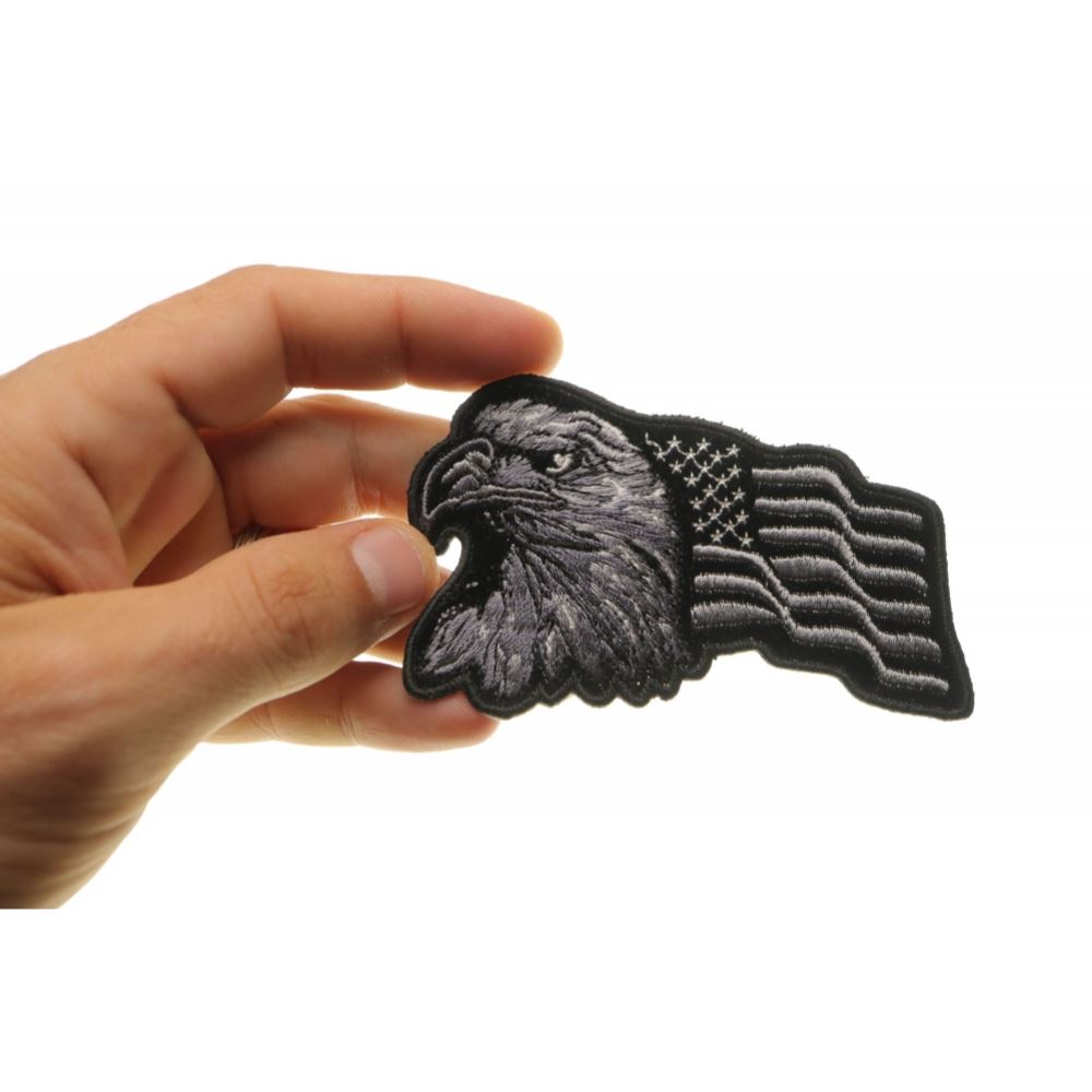 The 4x2.5 inch iron on patch has an Eagle Head with the American flag waving behind. The Patriotic patch is embroidered in black silver and white. Sew it on leather or nylon. You can also iron patch on to cotton shirts.