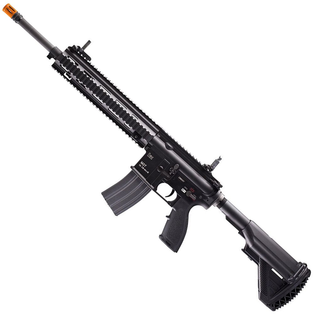 For full-auto fun in the field, choose the Elite Force HK M27 Electric Airsoft Rifle. This powerful AEG is a realistic replica of the firearm used by the United State Marine Corps. It is an ideal weapon for users looking to fill a support gunner role. Features include a full metal receiver and RIS, flip-up iron sights, a retractable stock, and adjustable hop-up system.