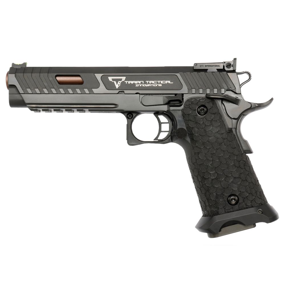 The JW3 STI Combat Master is the culmination of the ultimate competition pistol platform combined with master levels of tuning to create a handgun like no other. Wielded by Baba Yaga himself, this is the pistol used by John Wick in the 2019 film John Wick 3: Parabellum.Based on an STI 2011, the JW3 STI Combat Master is expertly crafted with slide lightening cuts to improve the cyclic speed and reduce perceived recoil. The forward swept front and rear slide serrations give a solid purchase for weapon manipulation. The extended magazine release helps with dropping the magazine without breaking your grip for faster reloads. The double undercut trigger guard lets you choke up higher on the gun for better recoil control. The large flared magwell assists with magazine insertion, helping to guide the magazine into the firearm. The grip stippling helps the shooter get a good purchase on the pistol and maintain a solid hold. The tuned trigger has an incredibly light pull and crisp break. The match grade coated barrel offers unmatched accuracy, consistency, and reliability. Other features include a full length, stainless steel guide rod and fiber optic front sight with adjustable target rear sight.