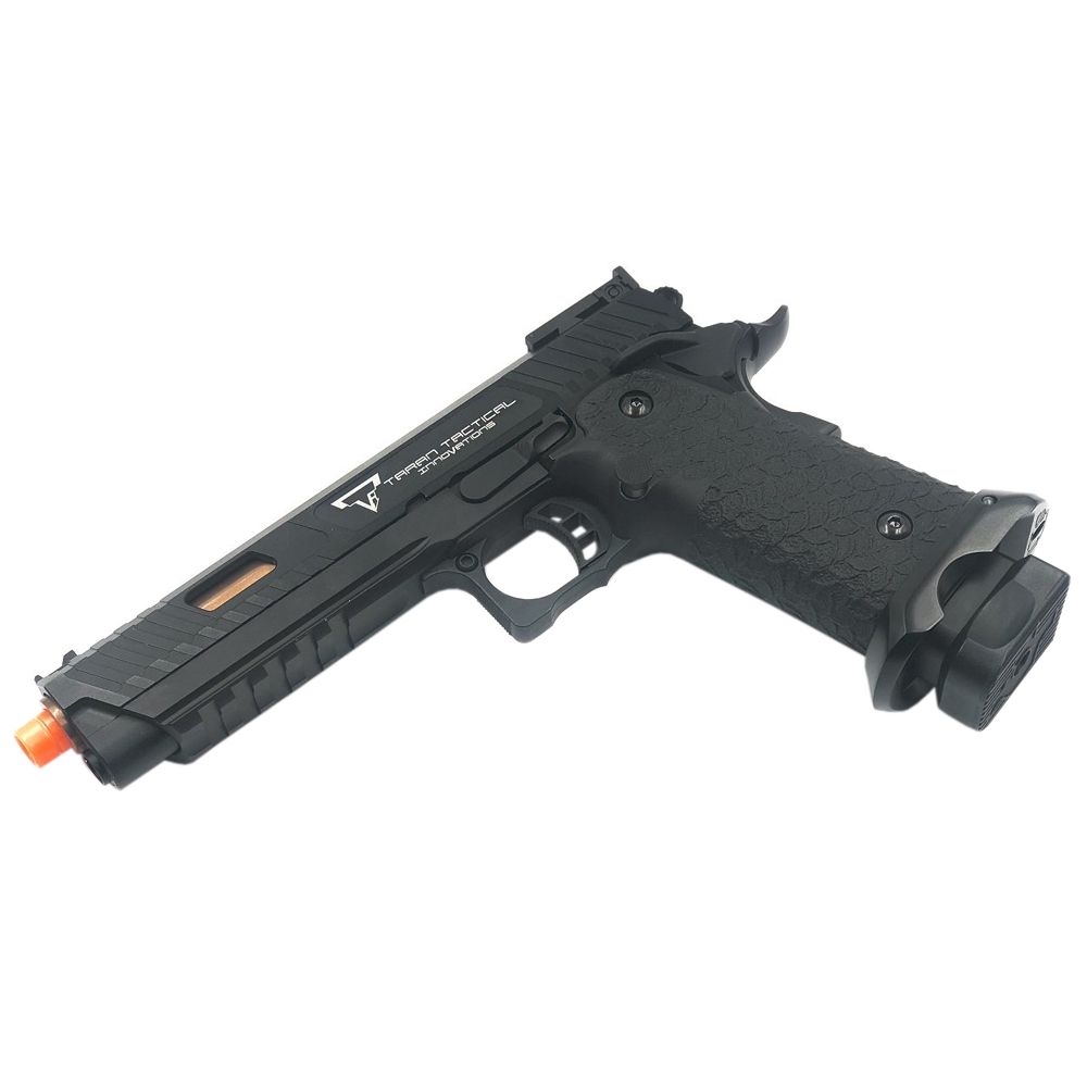 The JW3 STI Combat Master is the culmination of the ultimate competition pistol platform combined with master levels of tuning to create a handgun like no other. Wielded by Baba Yaga himself, this is the pistol used by John Wick in the 2019 film John Wick 3: Parabellum. Based on an STI 2011, the JW3 STI Combat Master is expertly crafted with slide lightning cuts to improve the cyclic speed and reduce perceived recoil. The forward-swept front and rear slide serrations give a solid purchase for weapon manipulation. The extended magazine release helps with dropping the magazine without breaking your grip for faster reloads. The double undercut trigger guard lets you choke up higher on the gun for better recoil control. The large flared magwell assists with magazine insertion, helping to guide the magazine into the firearm. The grip stippling helps the shooter get a good purchase on the pistol and maintain a solid hold. The tuned trigger has an incredibly light pull and crisp break. The match-grade coated barrel offers unmatched accuracy, consistency, and reliability. Other features include a full-length, stainless steel guide rod and fiber optic front sight with an adjustable target rear sight.