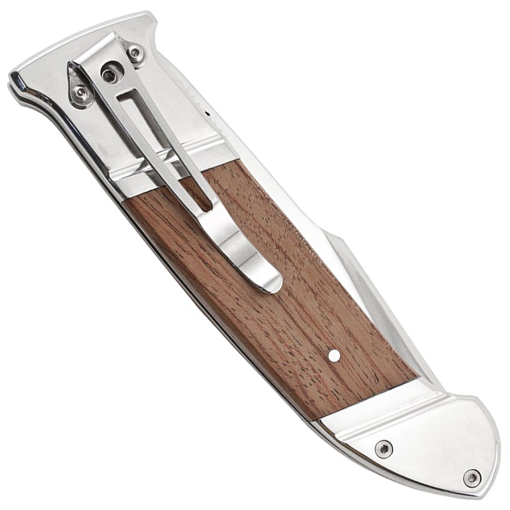 FF34-CP Fielder XL Knife is Made of 7CR17 steel with an attractive satin finish, this 4.13-inch straight edge, folding blade has a clip-point shape that allows a quicker and deeper puncture upon insertion, sharpens easily and makes quick work of any task. The proven Linerlock system uses a leaf spring wedged in the tang of the blade, providing reliability as well as one-hand opening of the Fielder's capable blade. The ergonomically contoured and well-balanced handle has a wood brown and silver finish with high luster bolsters and is made of vertical grain wood to provide a traditional look. The knife has a closed length of 5.5-inches, overall length of 9.63-inches, blade thickness of 0.115-inches and weighs 8.64-ounces. The SOG Specialty Knives & Tools FF34-CP Fielder XL Knife comes with a limited lifetime warranty that protects against defects in manufacturing and materials.