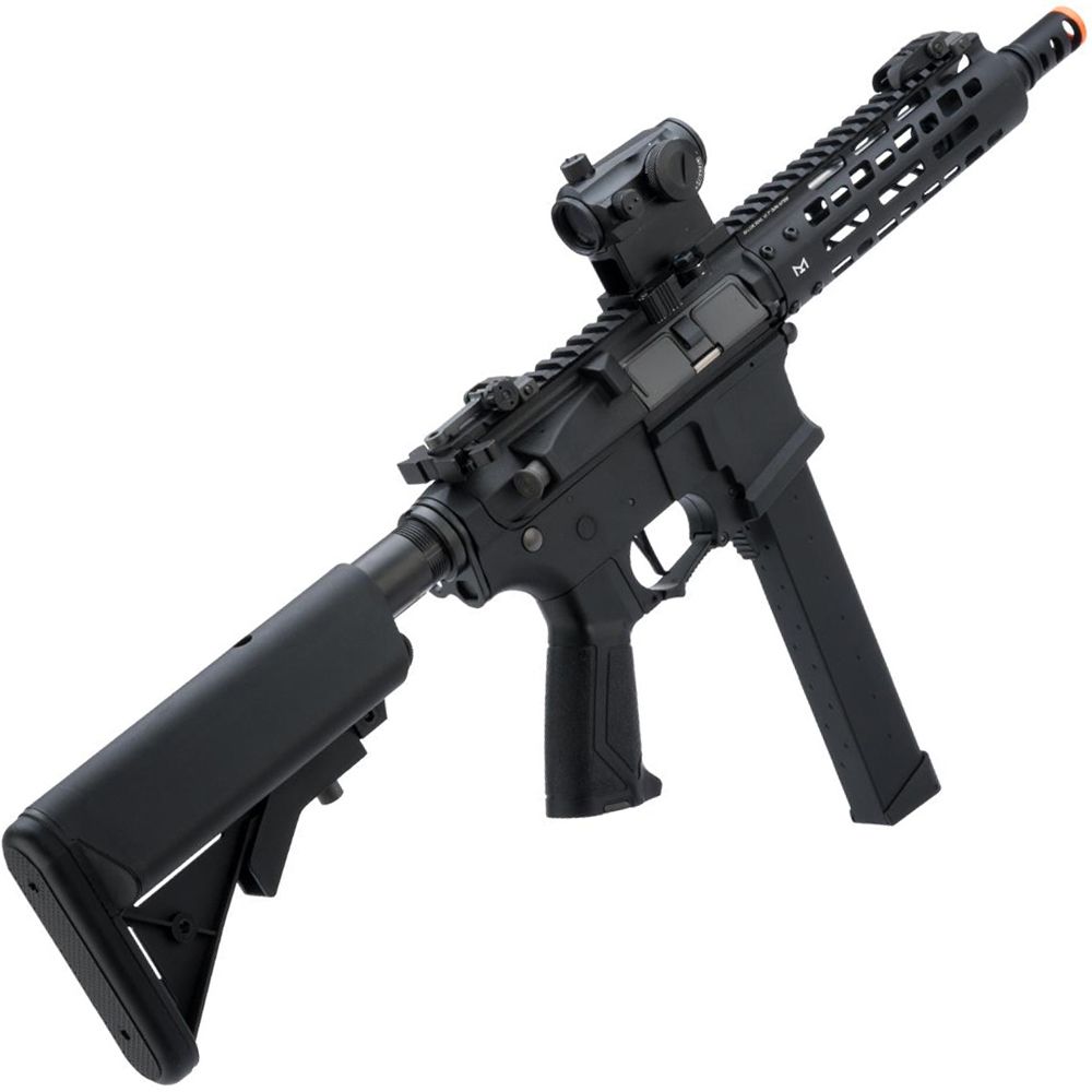 The G&G PCC9 is a unique and exciting entry into the CQB M4 style rifle AEG category. Extremely compact and lightweight, from afar the ARP9 resembles a traditional M4 type rifle, but when one gets closer, they realize the ARP9 is a completely different beast. Based off of the G&G CM16 series of AEGs the ARP9 retains all of the features favored by players but in a unique 9mm style carbine. Using the traditionally solid G&G gearbox, paired with their inline MOSFET, the ARP9 puts out all of the samer performance of a CM16 M4, but in a compact and unique package.