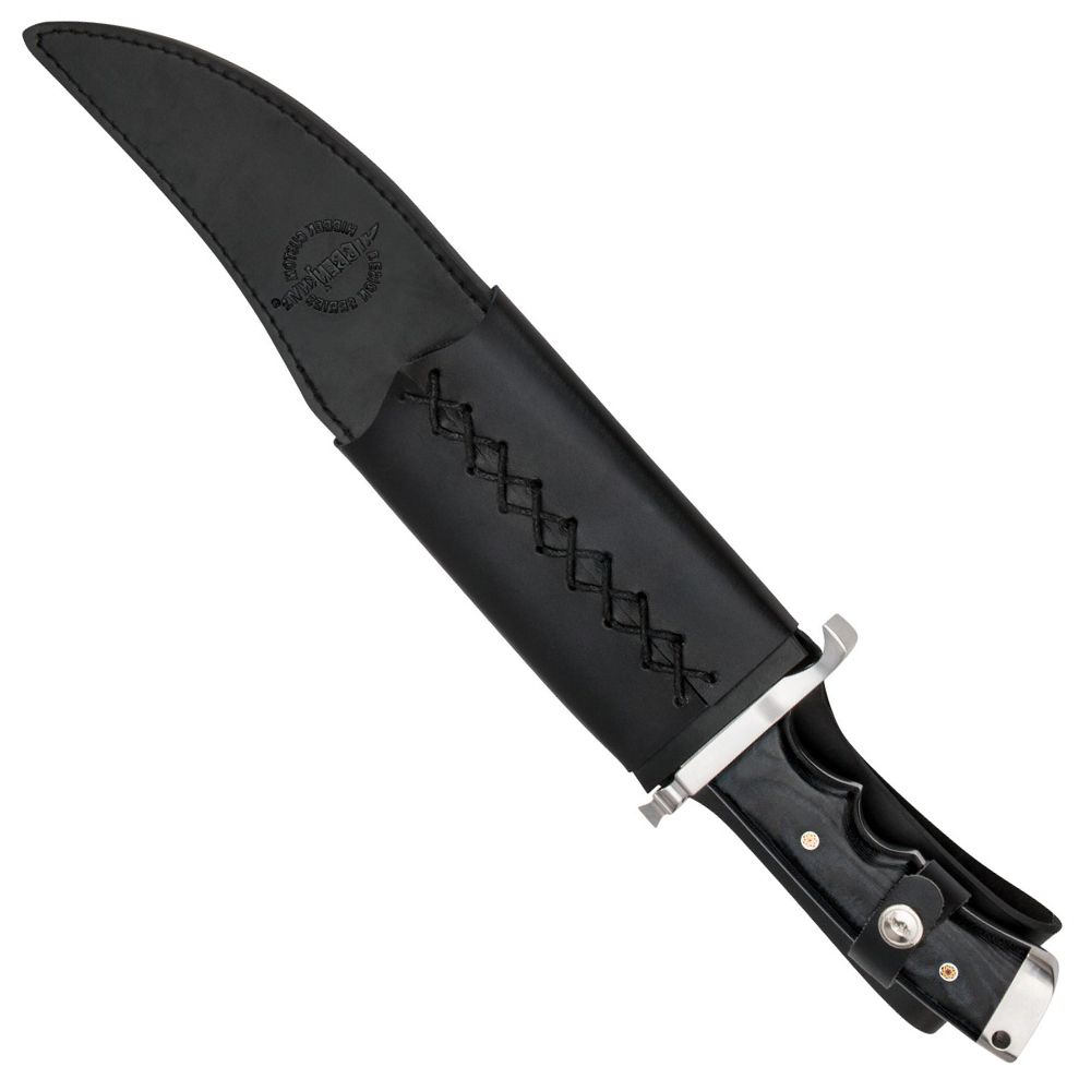 The new Hibben Magnum Bowie Knife, crafted by noted knife designer Gil Hibben, really is a beast of a bowie knife. You can't show this knife to folks without it broadcasting that you mean business. The 12 1/2" 3Cr13 rust-resistant stainless steel blade is massive. It features a stainless steel guard and pommel and a black Micarta handle with decorative pins. A leather body sheath with belt loop completes the package.