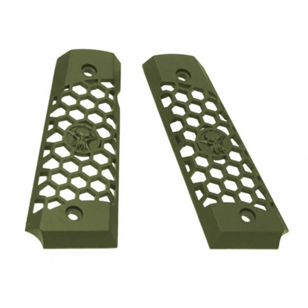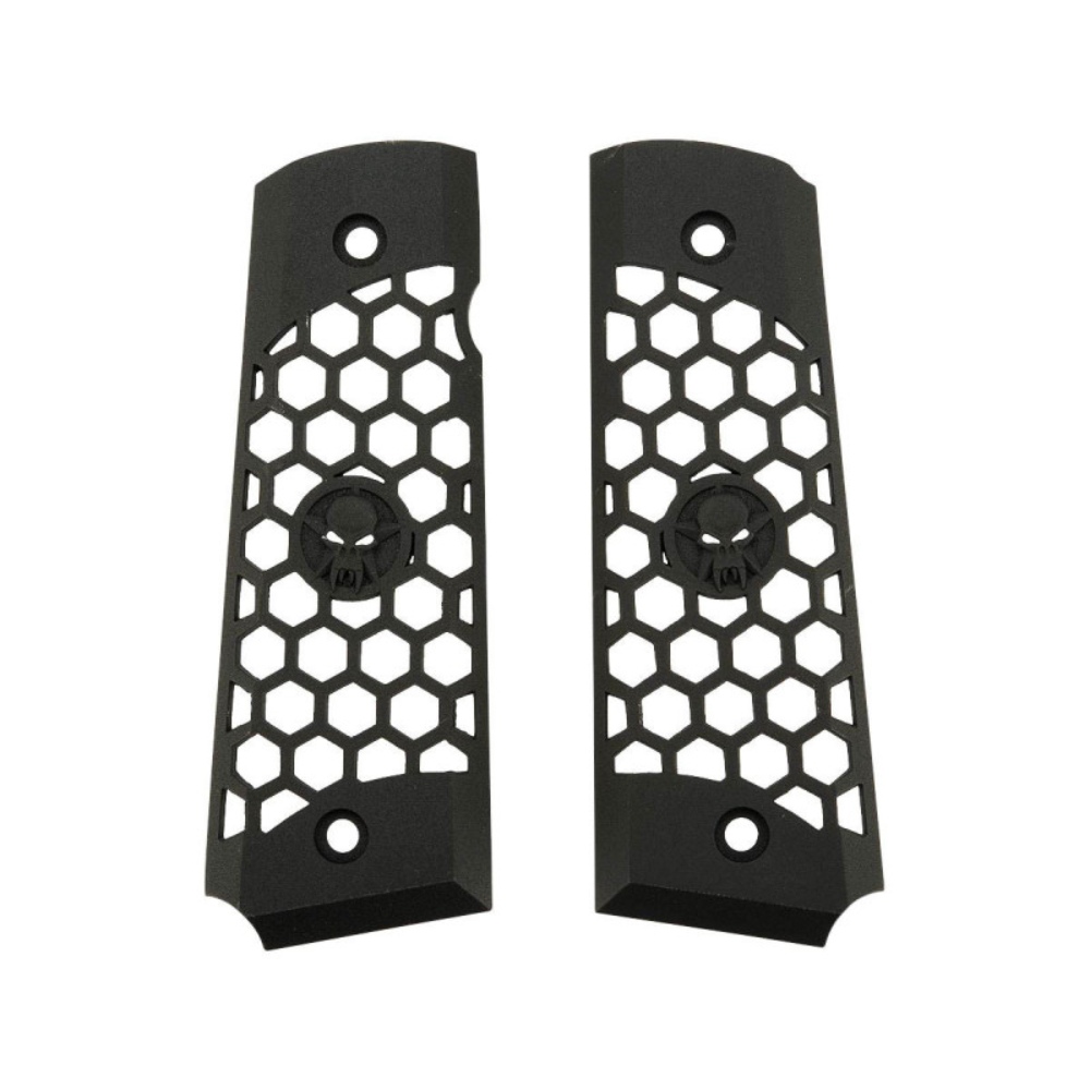 Give your 1911 pistols a very unique look. The combination of robust and “hex” shaped aluminum ensures amazing grip with durability while the embossed skull logo simply adds a very distinctive touch to the entire design.