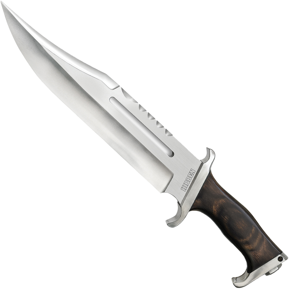 Introducing the Hibben III Bowie Knife, accompanied by its Leather Sheath—a faithful rendition of the legendary blade featured in a 1988 blockbuster, meticulously crafted by the esteemed knifemaker Gil Hibben. This fully-functional masterpiece, faithfully recreated from the original prop in the movie star's private collection, is expertly brought to life by United Cutlery employing premium materials and artisanal techniques. Enhancing the rugged charm of this replica is a satin-finished cast stainless steel guard and pommel. The ensemble is perfectly complemented by a genuine top-grain, vegetable-tanned leather sheath, providing both authenticity and safeguarding for this exceptional blade. Its handle, fashioned from luxurious dark brown wood complemented by black micarta spacers, not only exudes durability but also adds to its visual allure.
