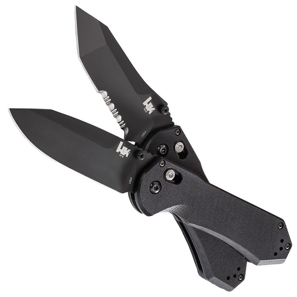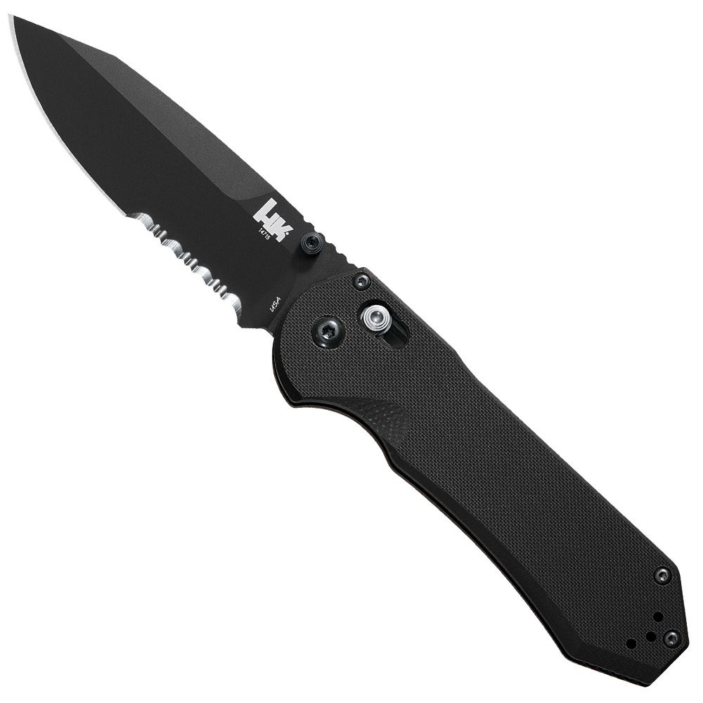 The HK AXIS Clip Point Folding Knife is a durable and reliable knife that features quality construction from its G10 handle all the way through its D2 steel blade. The AXIS lock mechanism is ambidextrous for easy one-handed opening during complex tasks. Jimping on top of the blade, textured scales and molded finger grooves provide superior handling in various grip styles.