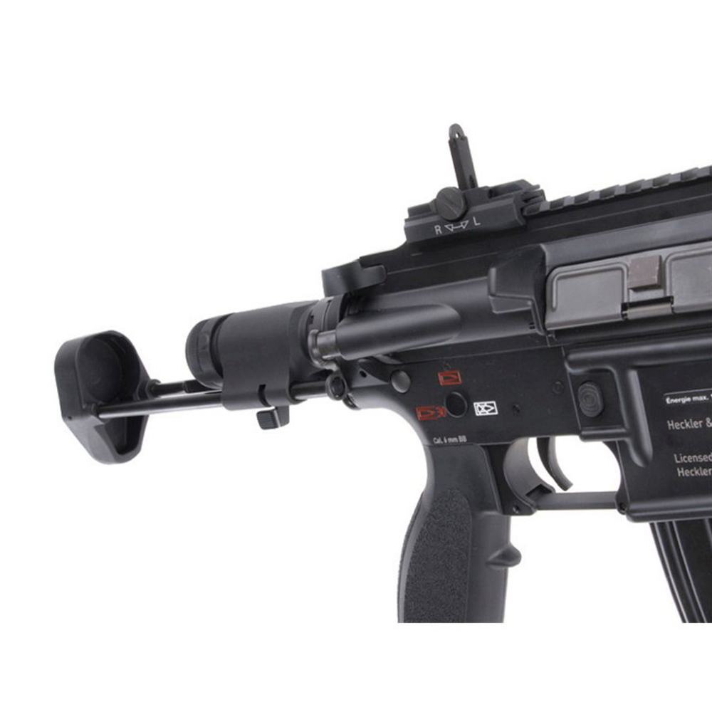 The HK 416 CQB is a licensed, authentic replica of the real 416 rifles used by military forces. The Metal receiver and high torque motor with metal gears and 8 mm bearings contribute to the elite status of the gun. The high-capacity, the 320-round magazine allows for lots of firing before the need to reload. The adjustable rear sight and adjustable stock allow for accurate and comfortable shooting. The metal-free float quad rail system lets you accessorize the gun to fit your individual specifications. Perfect for use on the mil-sim (military simulation) battlefield or in tactical training situations.