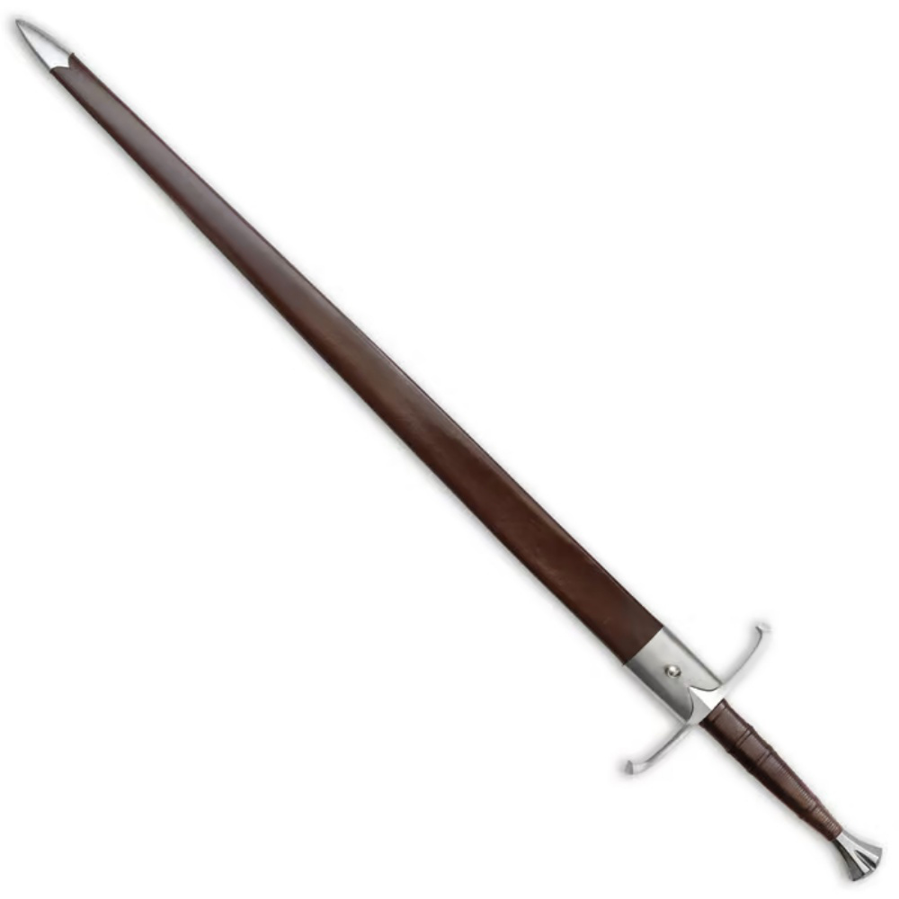 The Honshu Historic Claymore Sword is an exceptional addition to the Honshu Historic Series. It's a time-tested sword design with modern engineering. The 43 1/2” 1065 high carbon steel blade has a deep blood-groove and has a genuine suede wrap below the polished steel handguard. The wooden handle is wrapped in genuine brown leather with embossed cord grooves and the pommel is polished steel. The 57” overall Claymore sword slides smoothly into a premium brown leather scabbard with polished steel accents. Honshu continues to expand its exceptional sword line and this tactical Claymore sword is a must-have for your collection!