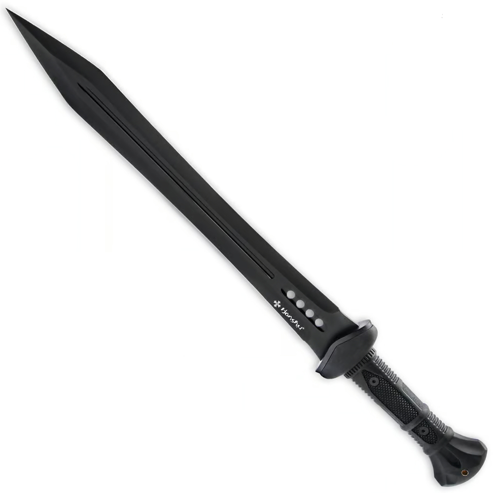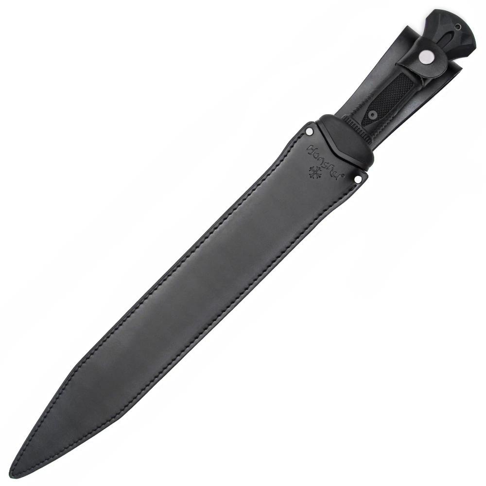 The Midnight Forge Gladiator Sword is a sleek addition to Honshu's modern weapons line. The sword has a keenly sharp, full-tang 18 1/4” black 7Cr13 stainless steel blade with a blood-groove and weight-reducing thru-holes. The textured and ridged, injection-molded TPR handle gives you a secure, slip-free grip in any weather condition. The 25” overall sword can be carried and stored in a genuine black leather belt sheath with snap closure strap. United Cutlery’s popular Honshu line offers sleek, modern elegance with a serious bite!