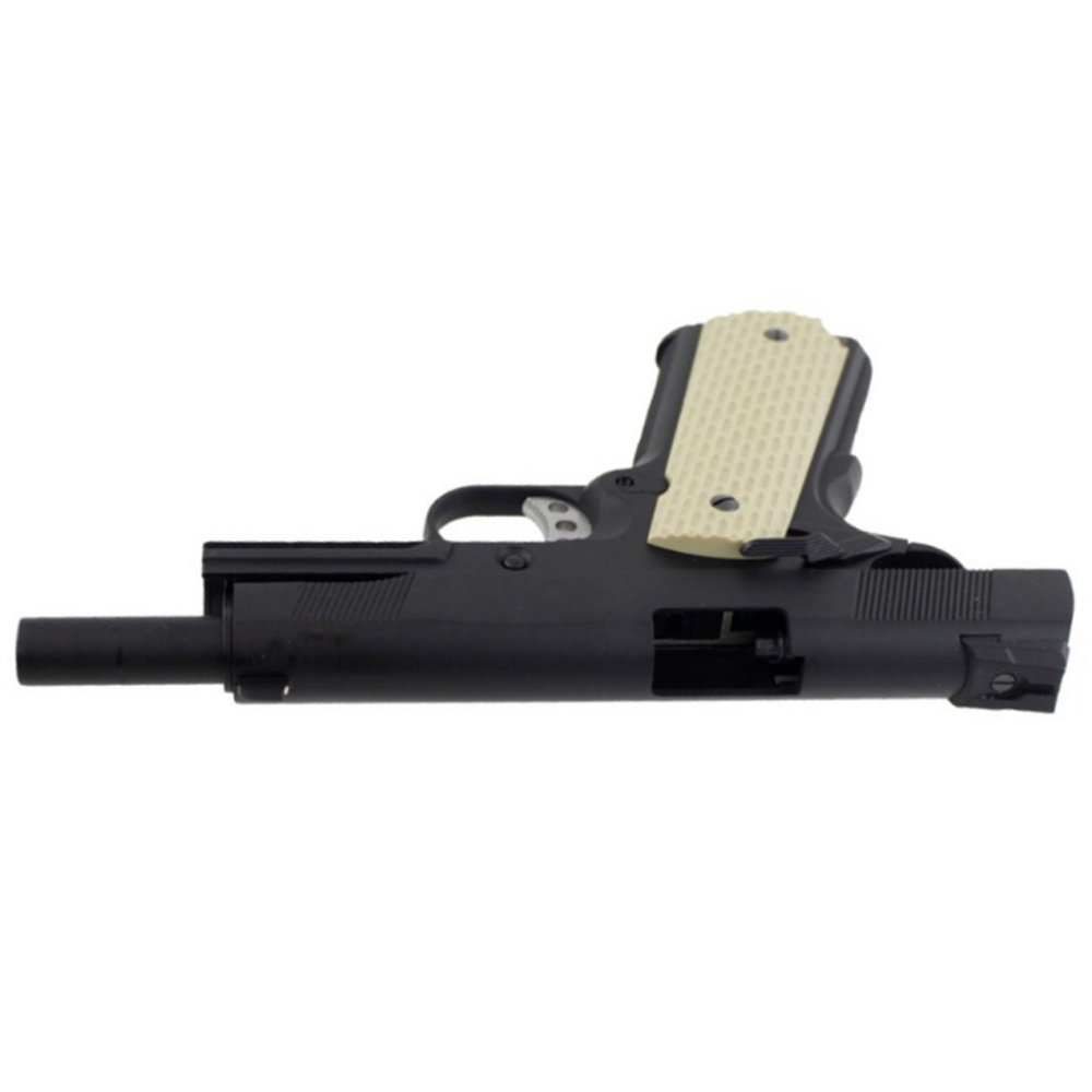 The KJ Works KP-01 E2 will ramp up your airsoft shooting experience, packing a powerful punchy blowback, a working decocker, fixed three-dot sights, and full field strip capability. The full metal mag can be loaded up to 26 rounds of BBs, making for a great sidearm on the airsoft field. It can hold a CO2 or green gas cartridge and features an authentic drop-out mechanism that makes even reloading feel real.
