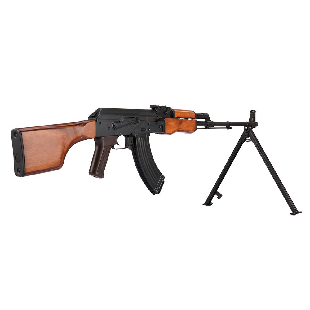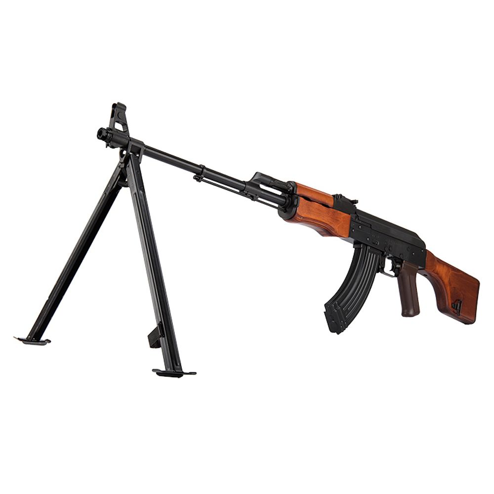 The LCT RPK LMG is the perfect option to take onto the field for you and your team. This airsoft gun can fill the role as a support gunner with you shooting a ton of rounds down at your targets with the included 600 round magazine. The RPK has a stamped steel construction to help simulate the weight of a real gun and a durable build that will last a long time. Additionally, there are wood hand guards and a wood stock the compliment that make this feel great in your hands. All this weight is not so bad to carry around with you since there is an integrated bipod. Use the fold-able bipod to mount onto a platform to have steady shots without worrying about dropping your aim. Take the LCT RPK LMG onto your next skirmish to ensure you have edge of battle with superior fire. Batteries and chargers not included.