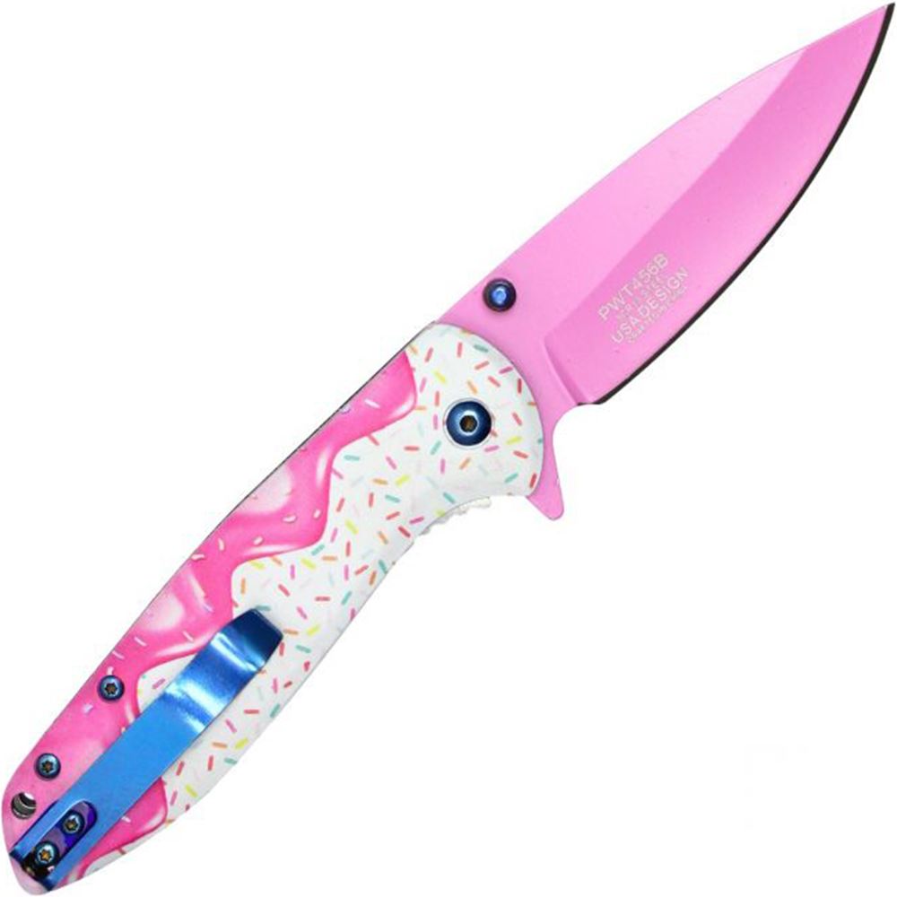 Treat yourself to sweetness with our WARTECH Sweet Treats - White Frosted Donut Pocket Knife. In stock and ready for adventure, this charming knife features a pink steel blade that adds a pop of color to its delightful white frosted donut handle. Complete with a convenient belt clip, it's perfect for easy carry wherever you go. Satisfy your cravings for both style and functionality with this whimsical addition to your collection.
