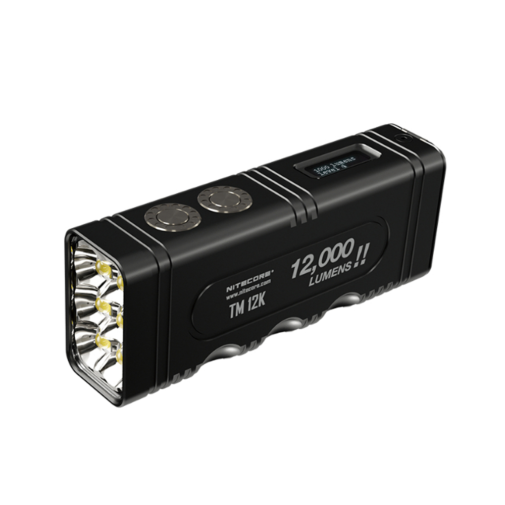 The Nitecore TM12K flashlight has an incredible maximum output of 12000 lumens from the 6 x Cree XHP50 LEDs and is powered by a built-in li-ion 21700 battery. The torch is rechargeable via the USB-C port at the base of the light and can fully charge the battery in as little as 1.5 hours.